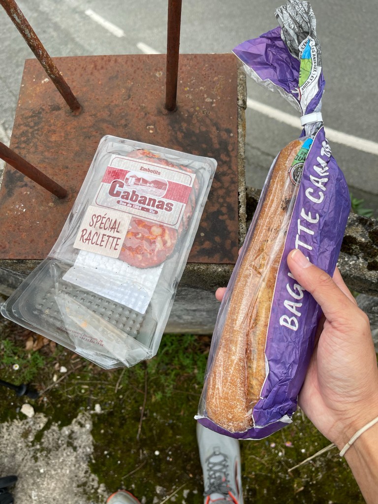 At Varlcarlos, there’s a bar next to the supermarket and I decide that I need a café con leche (coffee with milk). Feeling hungry and remembering I’m in Basque Country and should sample the local food, a sign for €2 pintxos (small snacks) catches my eye. I recognise jamón (cured ham), tortilla (potato omelette), and bacon, but not txistorra (“x” is pronounced like “ch”). Turns out it’s unique to Basque Country! I order it, and it is revealed to be a cured sausage, a chorizo of sorts. I’m pleasantly surprised that it comes in a baguette sandwich that’s not that small. The txistorra is thinner, but fattier and chewier than a normal chorizo, which tallies with what I find on Wikipedia: it’s 70-80% fat. Thank goodness I’m walking.