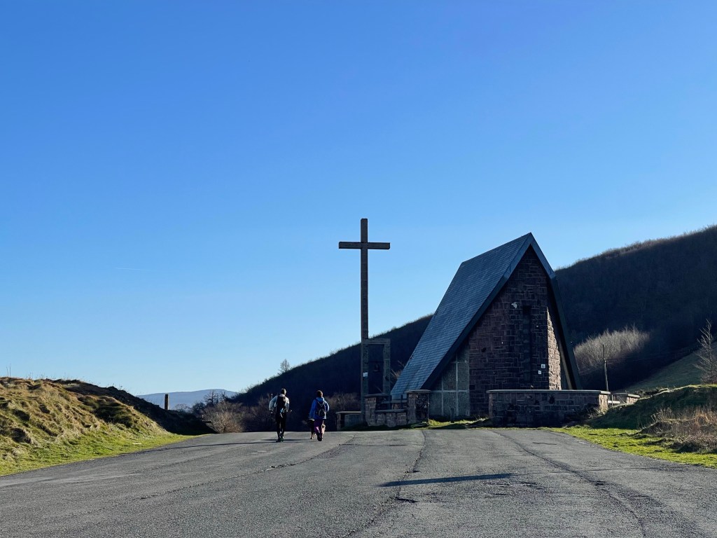 I eventually reach the top and a church comes into view. Suddenly an epic unending wind hits me (probably because there is finally nothing blocking it) so I wear my rain jacket for the first time on this trip. It’s then all literally downhill from here for less than two kilometres, and I feel a skip in my step. Roncesvalles is close!