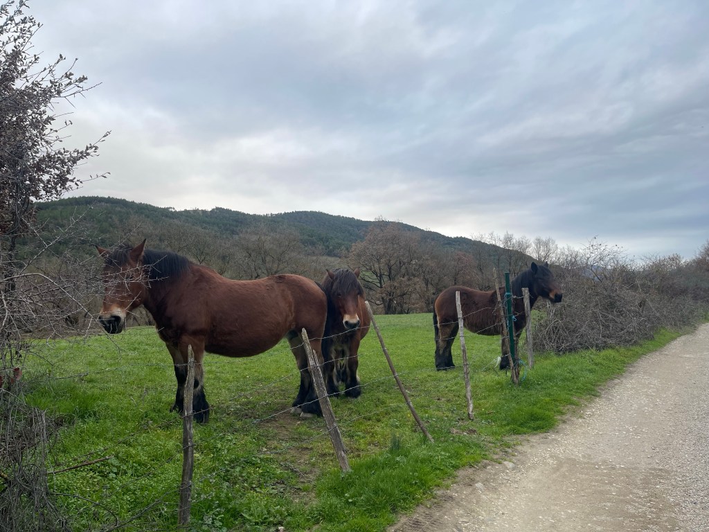 There’s no dramatic sunrise this time with extensive cloud cover. Just a gradual lightening. The fresh cool air feels great to breathe. We walk past a magnesite quarry, and continue on through a variety of terrain: fields, forests, fallen autumn leaves, rocky paths, earthy trails, and manmade roads. At points there are a smattering of droplets, but no ensuing rain. No wind today too. Some parts are alongside flowing rivers, which is nice.