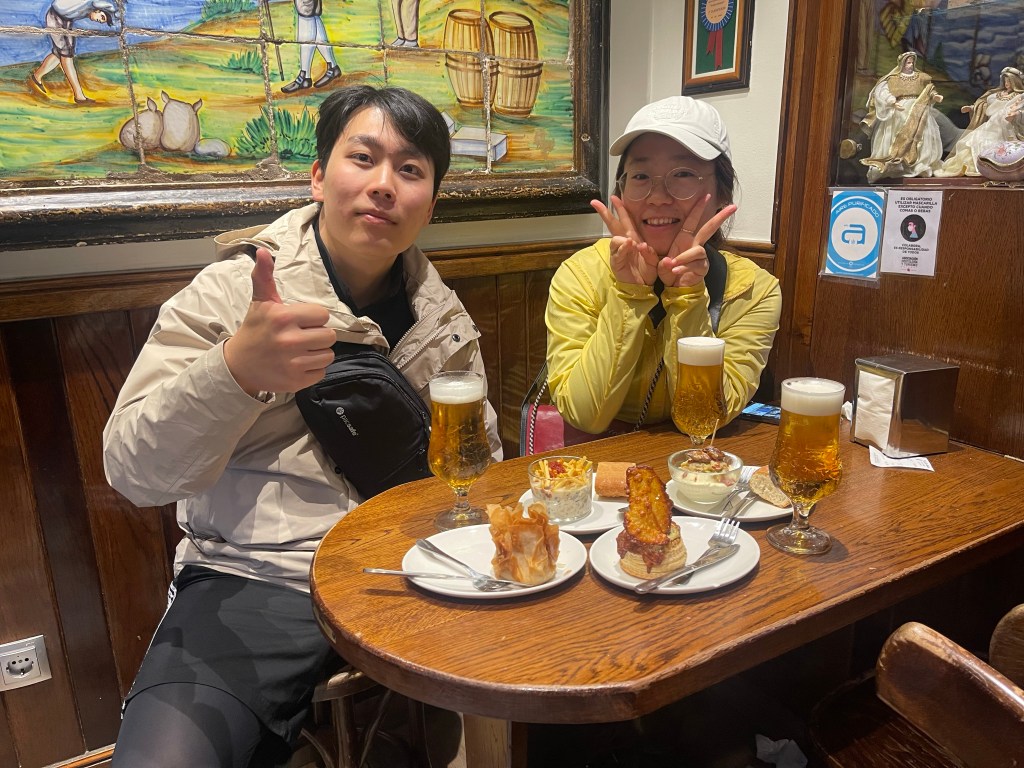 I order a media lomo (pork tenderloin), a cheesecake, and a café con leche. Ji Sung and Areum both get pintxos txistorra, lattes, and Areum even gets a beer, a special Christmas edition from Estrella.