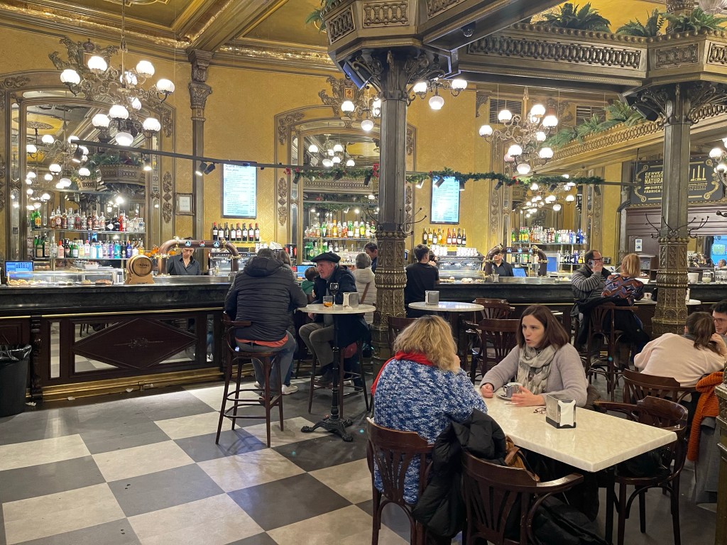 We go out in search of food, and land on a tapas bar called Bar Gaucho where everything we get is good. We continue with courses at Café Iruña, which has a nice interior.