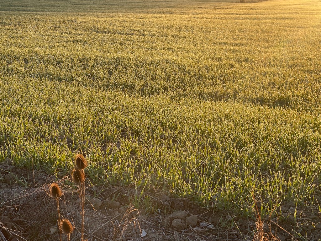 It’s 3°C, I’m exhaling steam and wearing my puffy, which I like because it makes me feel like an *important hiker*. The skies are clear, and as the pavement gives way to farmland the sun rises beautifully. We marvel at it and stop to take a lot of photos. The sun is on our left, so I only put sunscreen on the left side of my face.