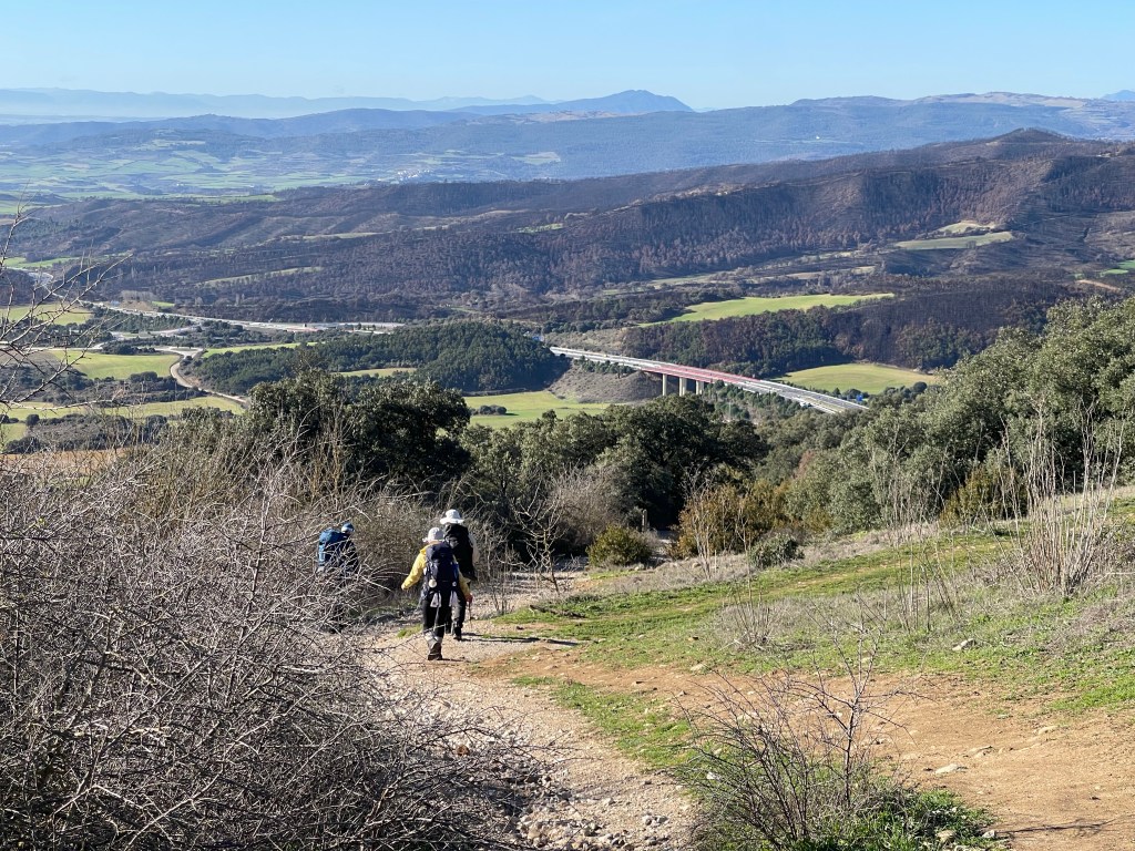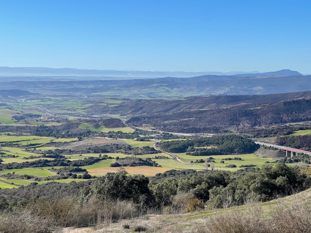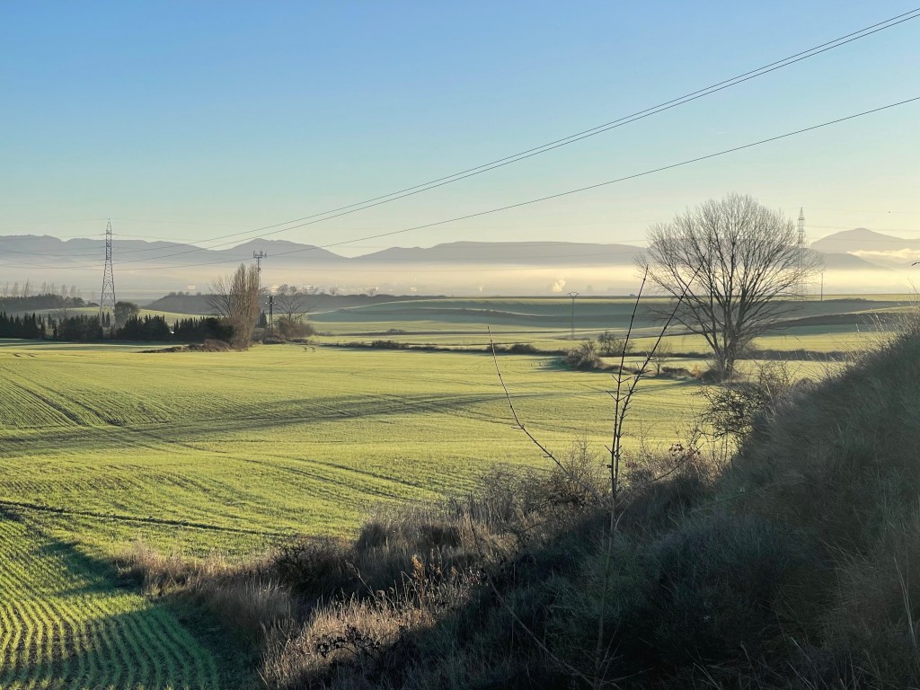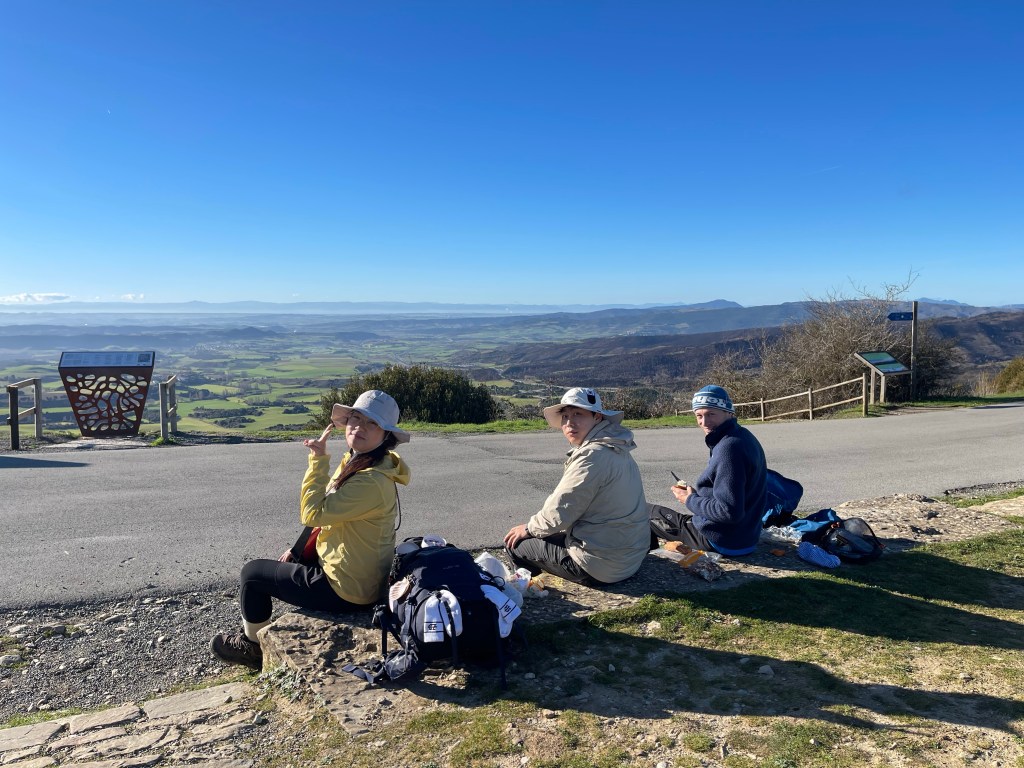 It’s a gentle upslope through the towns of Cizur Menor and Zariquiegui, which are quiet with nothing open. The more we walk towards the row of wind turbines, the more we ascend past rolling hills and see Pamplona laid out behind us. I shed my puffy eventually. We lose Ji Sung and Samuel, who walk faster, and towards the top I lose Areum as well, as I stop to take photos.