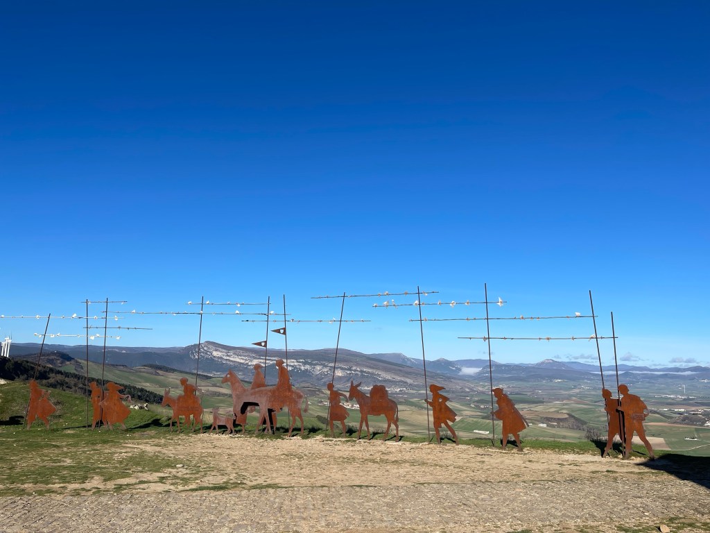 I reach the top, which is near the base of one of the wind turbines, and see the three of them waiting. They’re sitting down for a snack and enjoying the amazing view on the other side of the hill. The iconic metal Camino sculpture turns out to be here too.