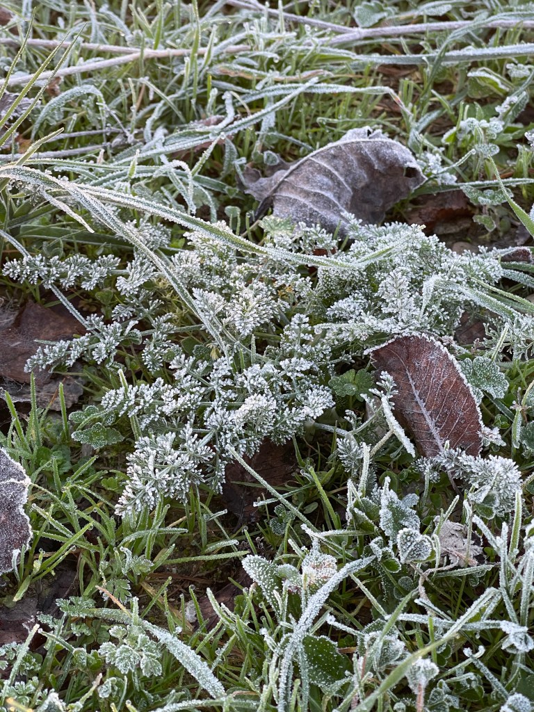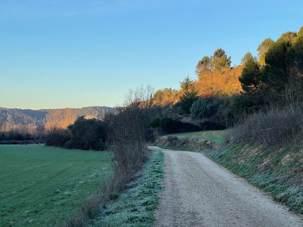 I follow a quiet path that starts adjacent to a highway, then splits off, goes under it, and joins a river. The shrubbery has frozen dew on it, just like my socks. I’m still coughing a bit, so Halls is my best friend.