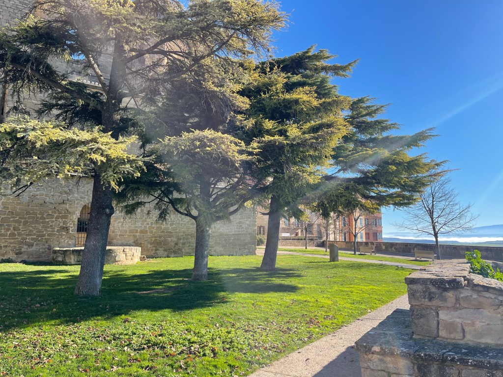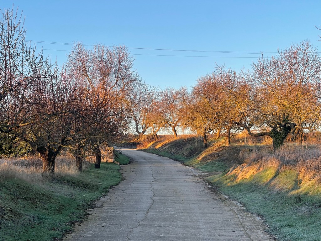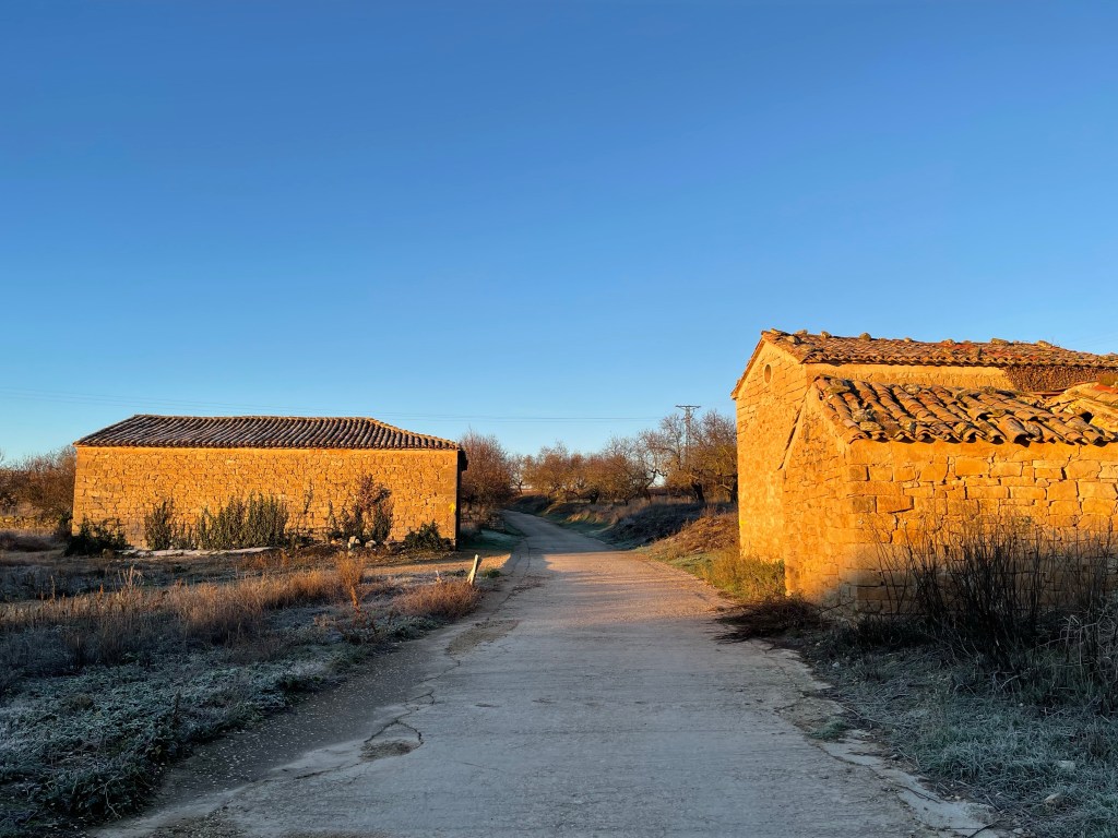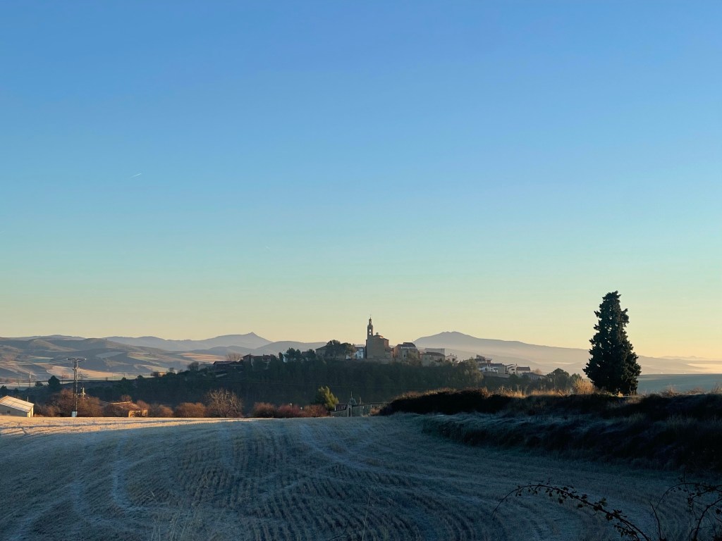 I leave the town among golden houses and trees. Up a slope to farmland, Torres del Río is picturesque behind.