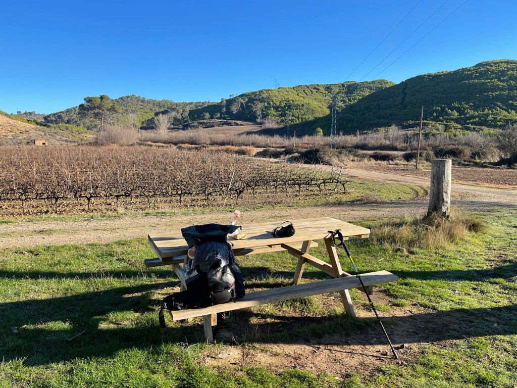 After some vineyards, I come to a nice bench area and have my second breakfast, which includes bread with some crema de jamón york, which I find tastes like luncheon meat. The sun is bright, and I feel so happy right here with my picnic. A thought crosses my mind—why is no one here with me? Of all the people in the world, only I have decided to be right here, at this time, having this nice meal. Everyone else in this world has chosen differently now. Oh, but it would be nice for them to share in such a beautiful moment.