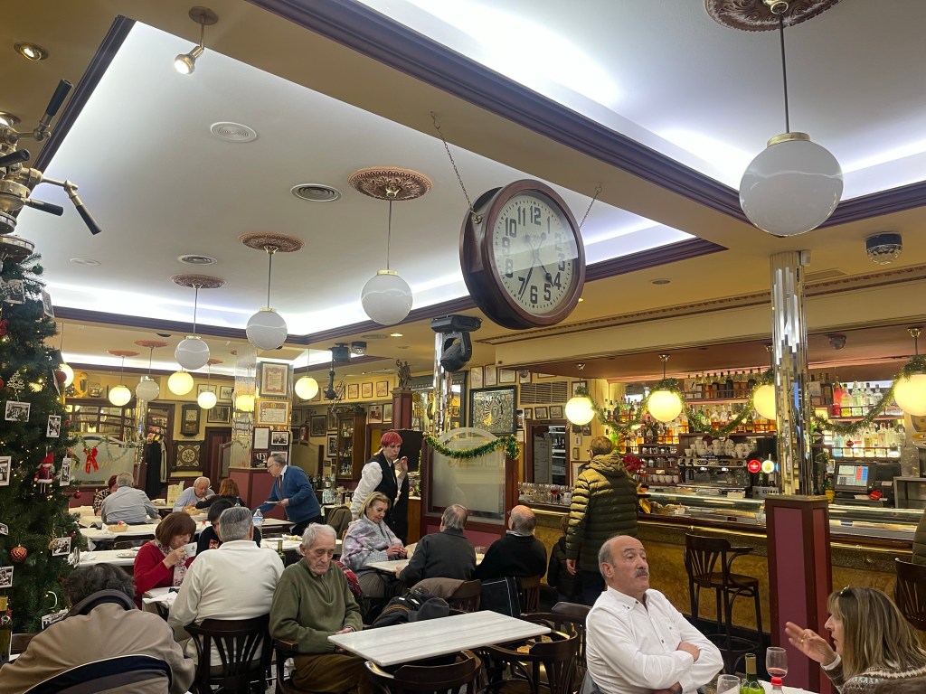 We are heading out for…lunch? Whatever you call the 4pm meal for walkers. It’s at a place called Café Moderno, which Diego says he always eats at when he’s in Logroño for the Camino. For the menú del día, I get garbanzos (chickpeas) stew, bacalao (cod), tarta con queso (cheesecake, this one with blueberry jam)—I realise Basque cheesecake is still my favourite—alongside bread, wine and beer. We end the meal with cafés con leche.