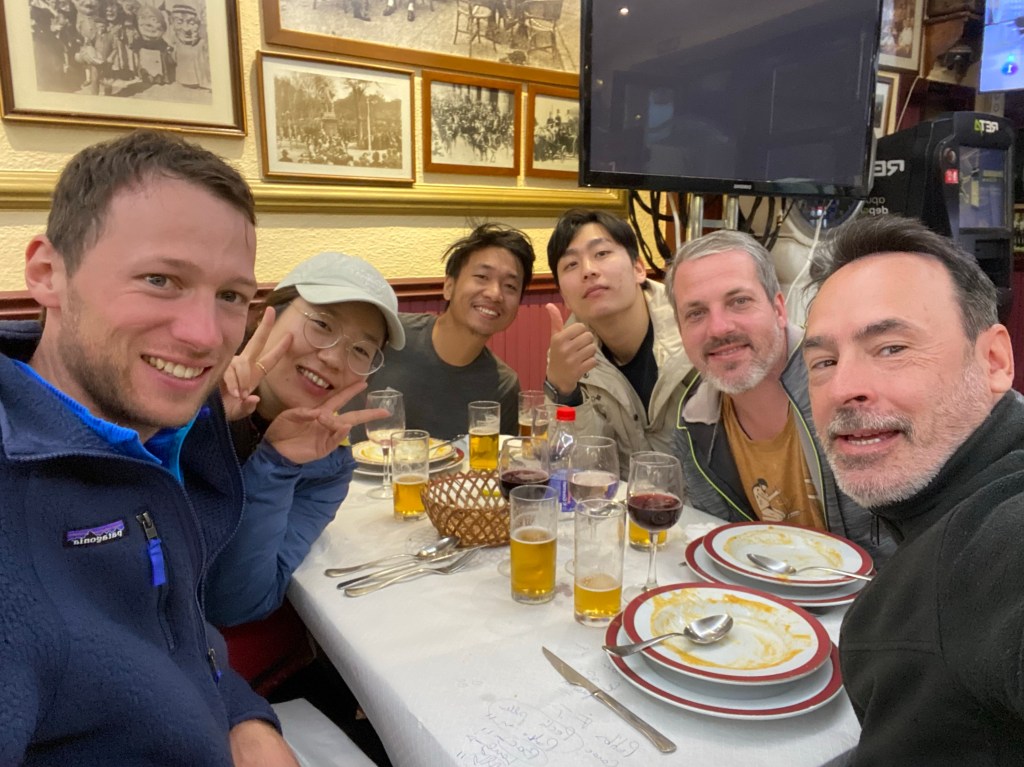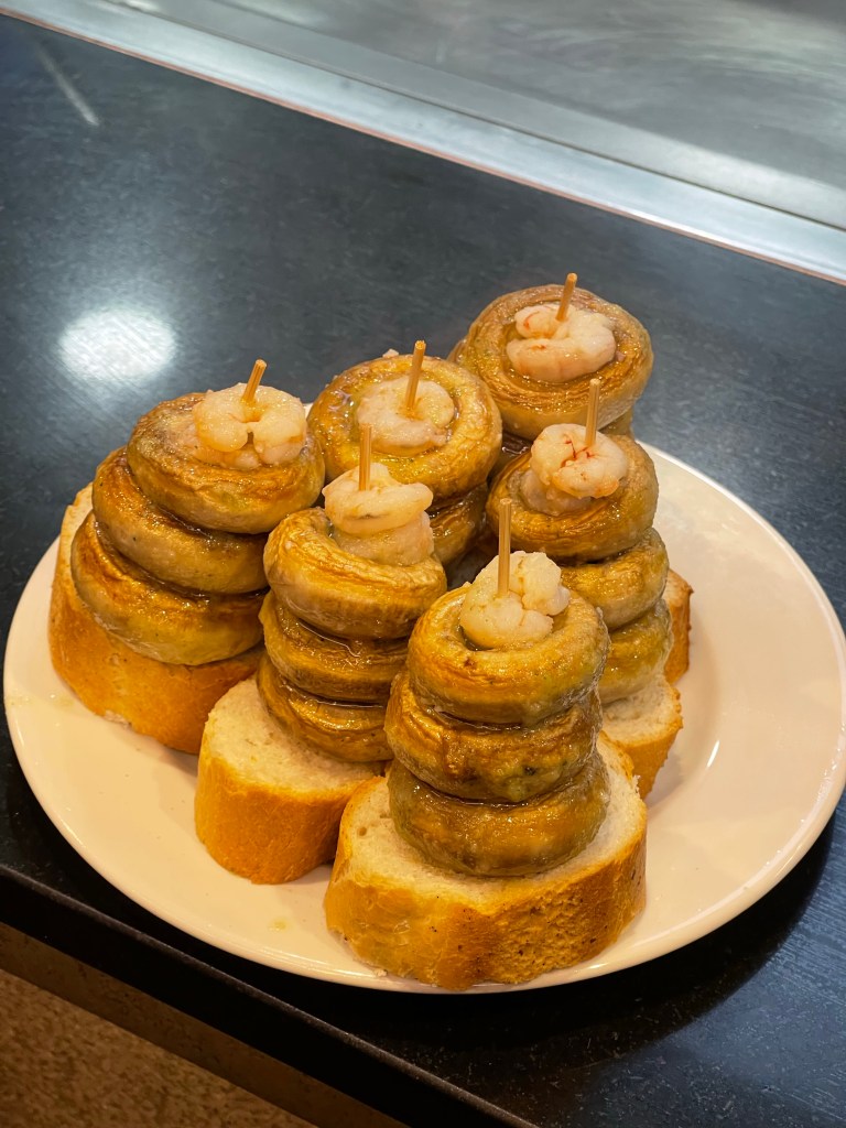 We start with salchichón (cured sausage), then calamares (squid). Then a standout, a mushroom prawn tapa from a place called Bar Angel which only serves it. We then follow with pulpo a la brasa (grilled octopus) which is great, and end the night with gilda, which I love. The group takes turns to treat each tapa, which is sweet.