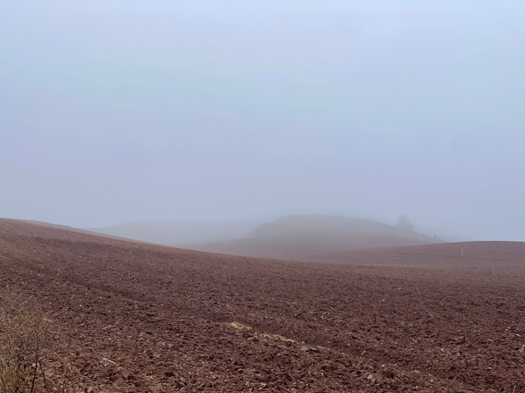 We walk past tilled fields of maroon earth. The mist in the distant trees look like a Chinese painting.