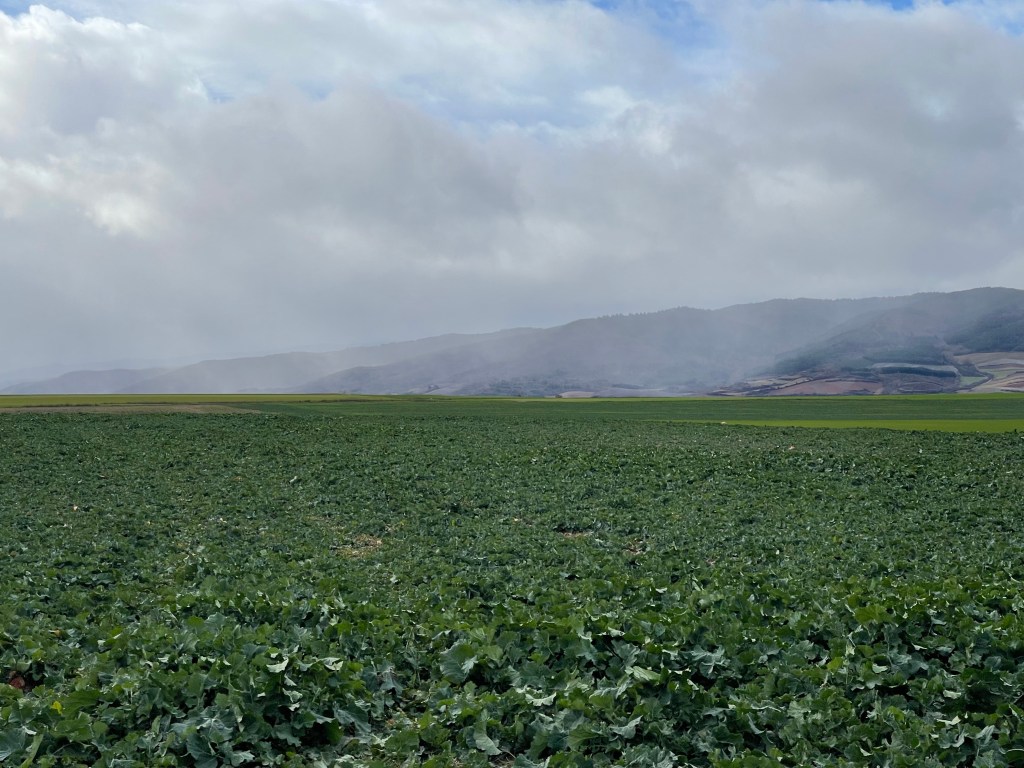 We leave the fog behind to open fields of what Samuel tells me is canola. Cloud cover is light so the fields are pretty. Strong winds start, and I put my damp laundry back on my bag for drying.