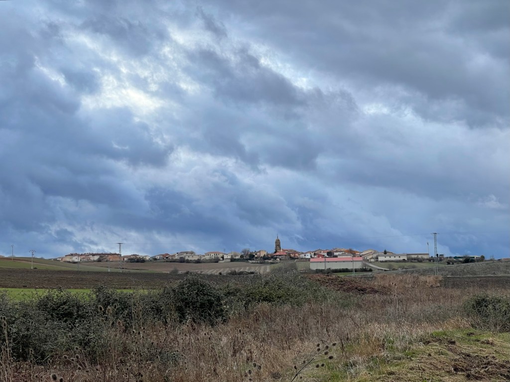 From a dirt path beside a highway, Grañón is visible a few kilometres away, framed by dramatic clouds.