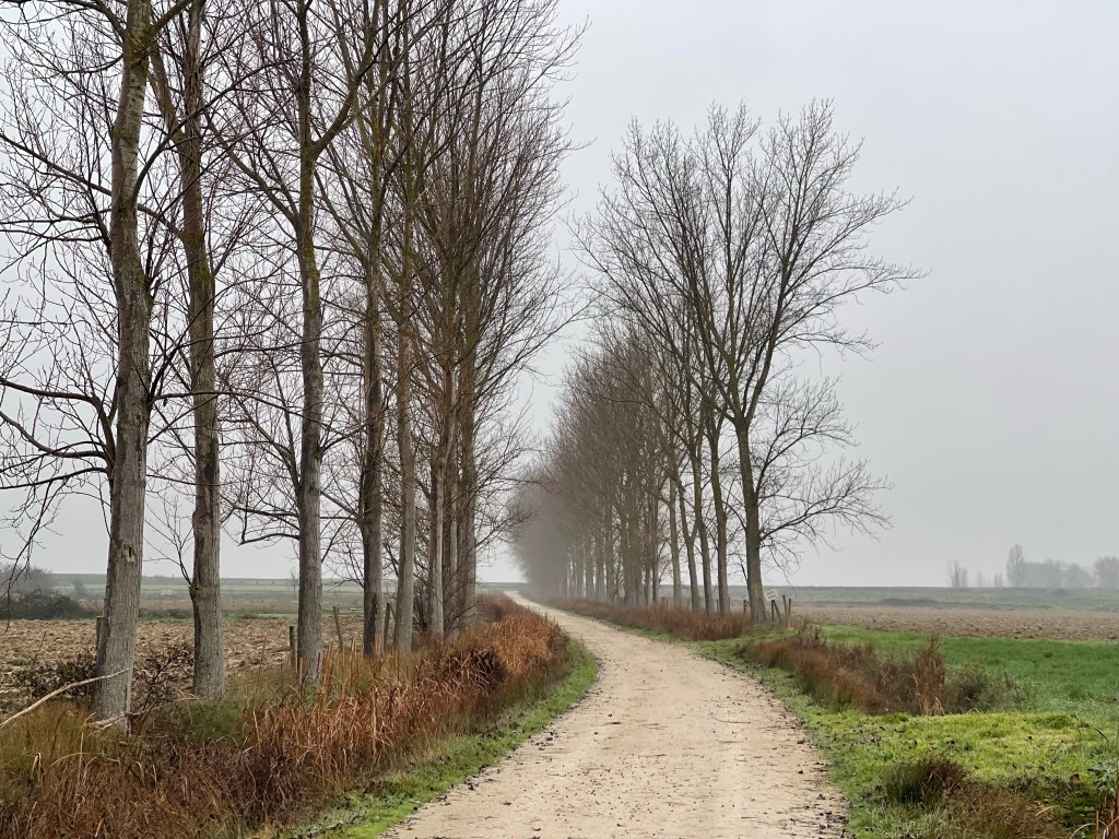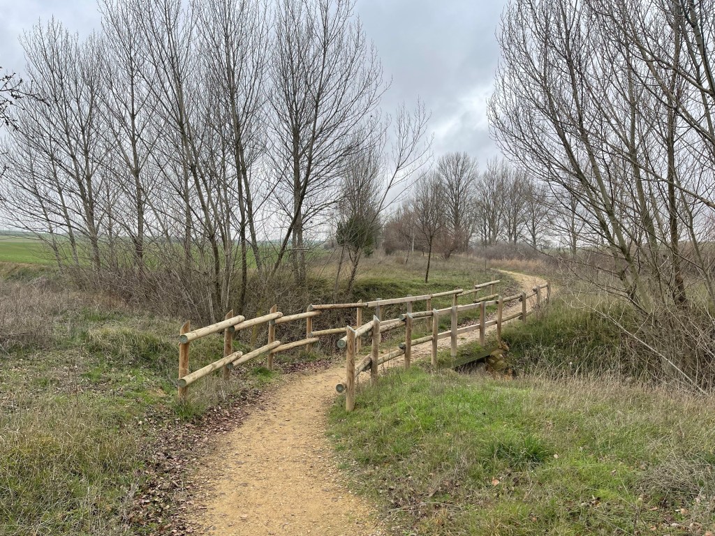 We have kilometres to make, so we bid our goodbyes. It’s a long, straight road leaving town, with electric towers and winter trees for company. We are soon asked to choose a road at a split—either along a river or through Revenga de Campos. We choose the river.