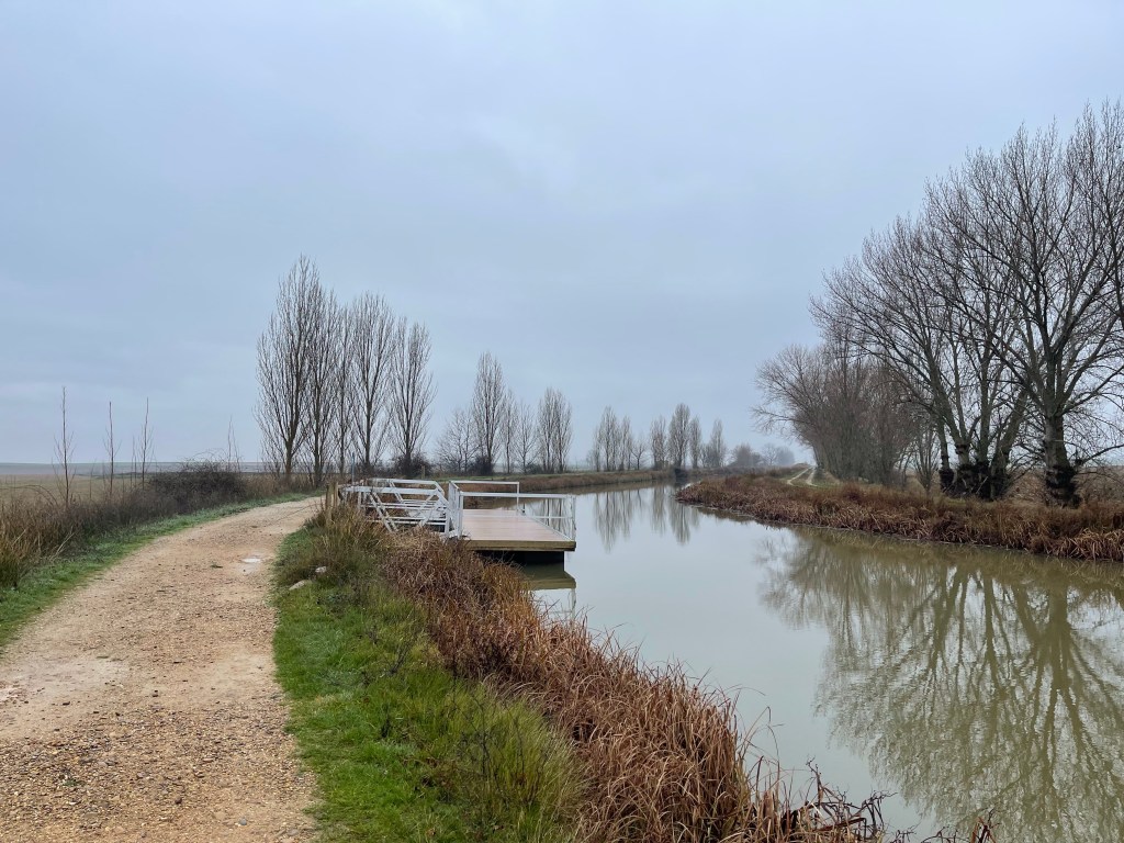 The drizzle stops and my path joins the banks of the Canal de Castilla, a tranquil river lined with grass and leafless trees. And with the start of this juncture, the trail of sheep poop finally ends too.