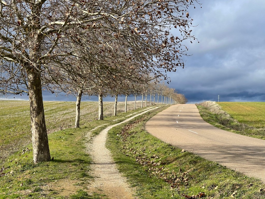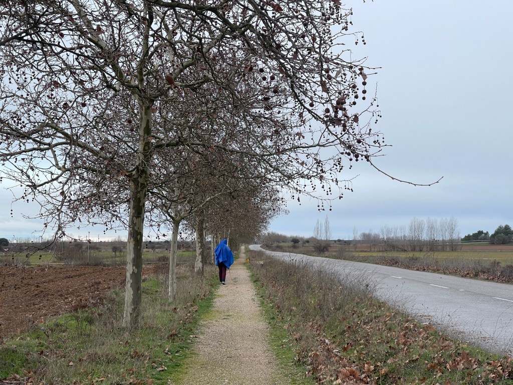 We follow a roadside path which has row after row of leafless trees arching over the path, which I’m sure would be great shelter for the pilgrims during summer. It’s a mostly straight gravel path, and nary a car passes us by (they probably take the nearby highway instead), so the walk is idyllic.