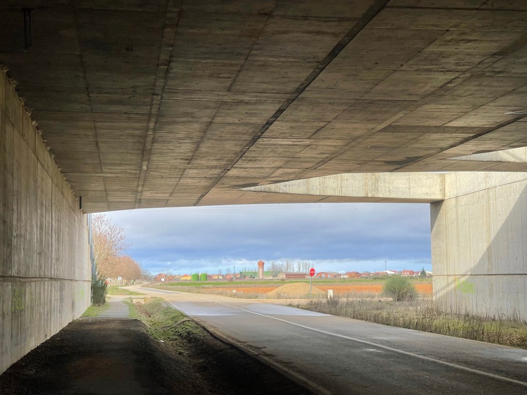 We leave the bar after sunrise at 8.45am, when it’s no longer raining. We take a bridge out of town and follow a path alongside roads. After a road junction crossing, we are to make a choice between two routes, that will meet later 36km away at Mansilla de las Mulas. We take the original Camino route because it gives us more options for accommodation this winter.