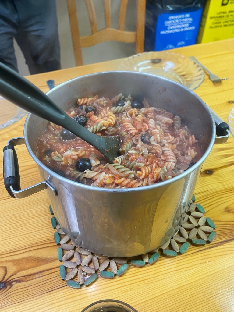 Edoardo makes the fusilli with a tomato-based sauce and black olives, with some prep assistance from the rest of us. It is delicious.