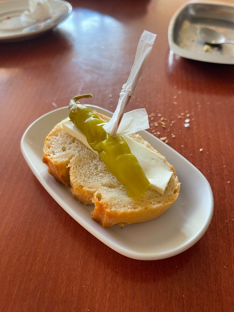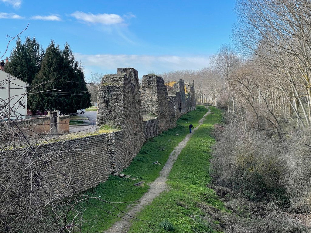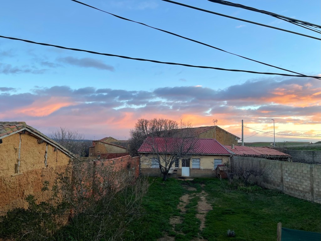 Mansilla de las Mulas seems like quite a pleasant town, and a nice place for pilgrims to sleep at as well. We stop for coffee to warm up—I get a cortado, a tortilla picante (spicy potato omelette), and a pincho con guindilla y queso fresco (green chilli and fresh cheese skewer).
