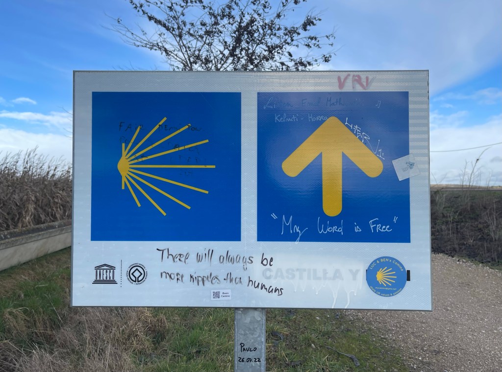 We leave the comfort of the cemetery wall back onto the path, with the wind pelting snow into our faces. I have my sunglasses on to protect my eyes from snow, and my buff up the bottom half of my face. The buff is not water resistant, however, so it gets cold and wet. Snot is running down my nose and mixing into the wet buff pressed against my face, and I mentally steel myself to accept these sensations for the next few kilometres to León.