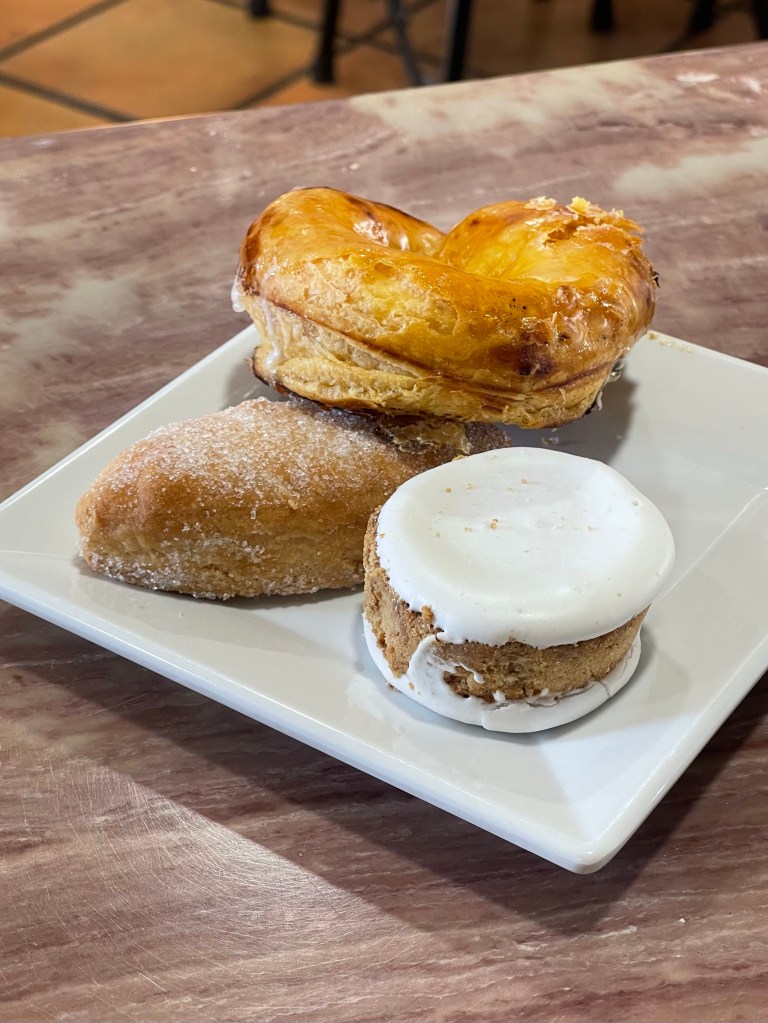We reach Puente Villarente after a short distance from our break area, and enter an inviting confitería. Apart from some coffee, I get a cróqueta with cheese and jamón, and we share some special-looking cookies.