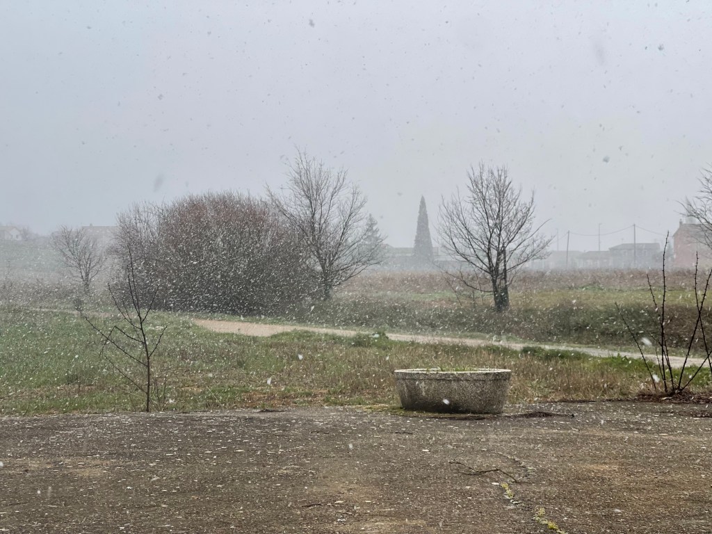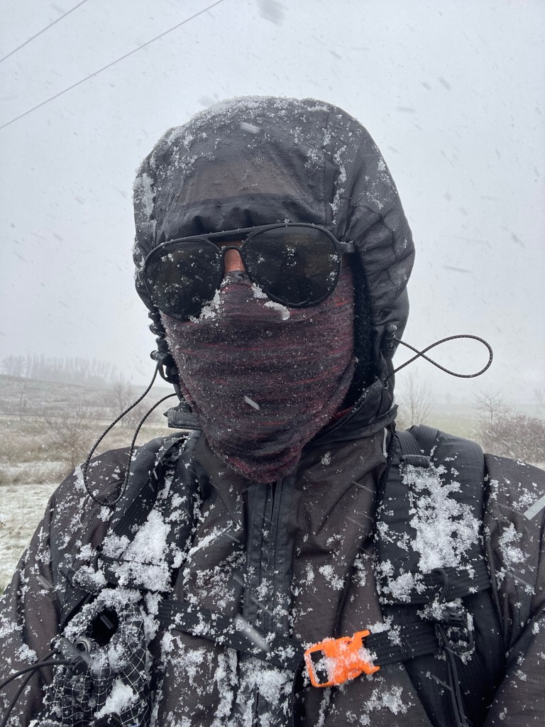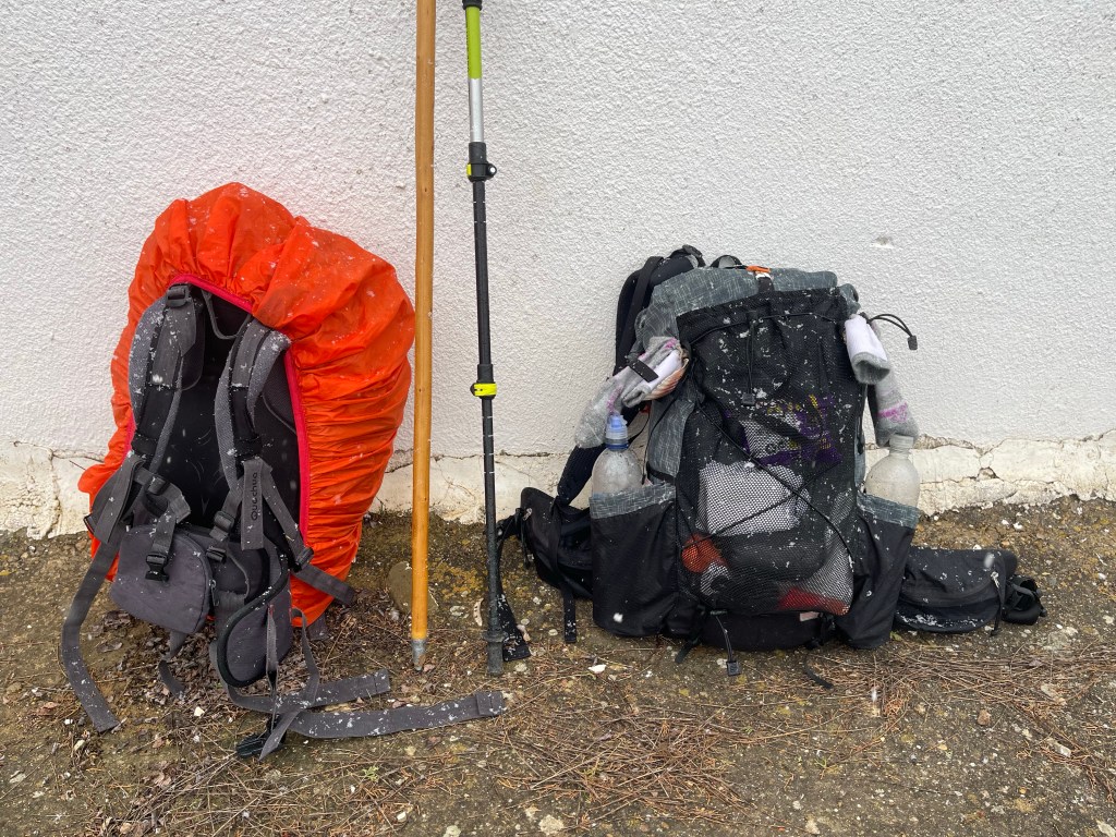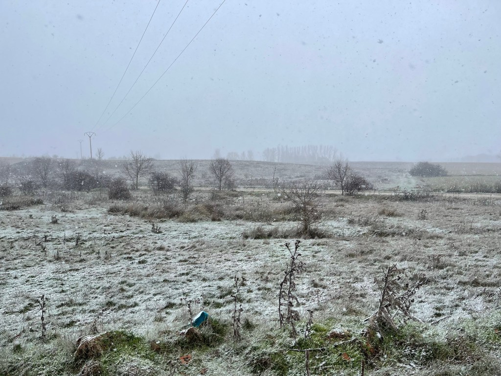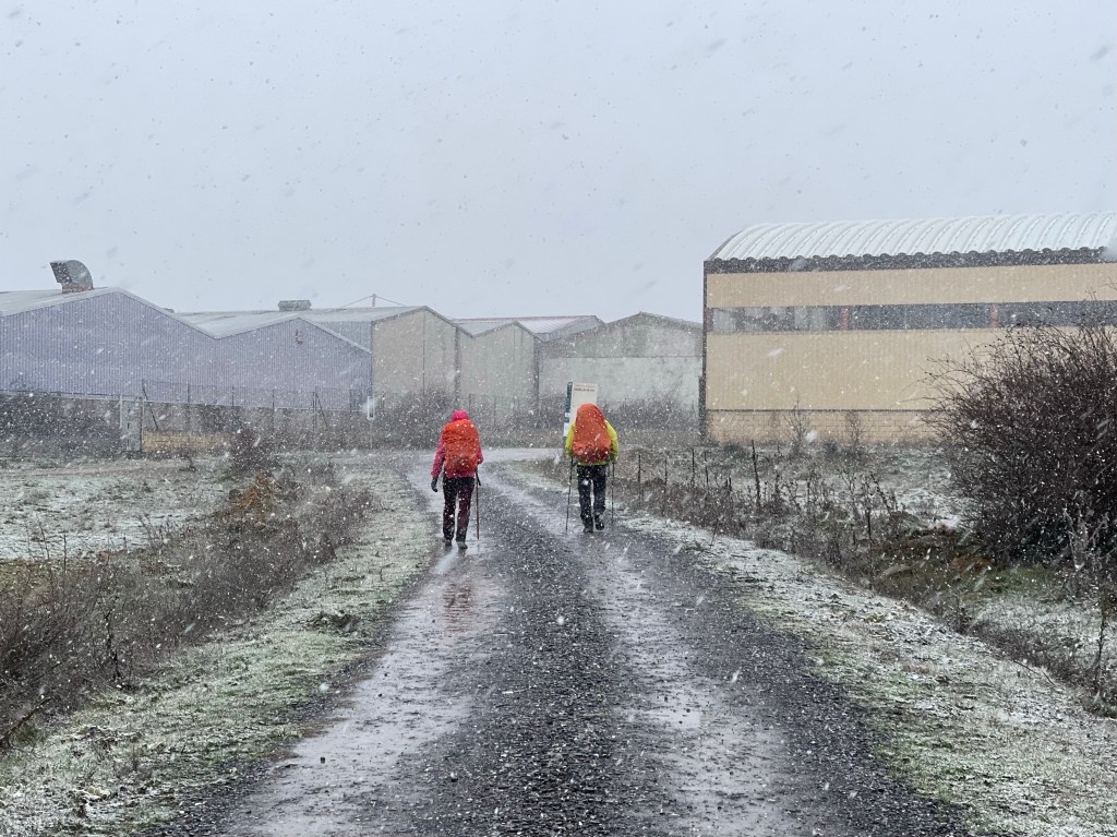 Some snow then drifts around us amidst the heavy winds. More and more until suddenly…it’s snowing! I take note of the time of this momentous occasion: 2.40pm. The “Winter Camino” finally begins.