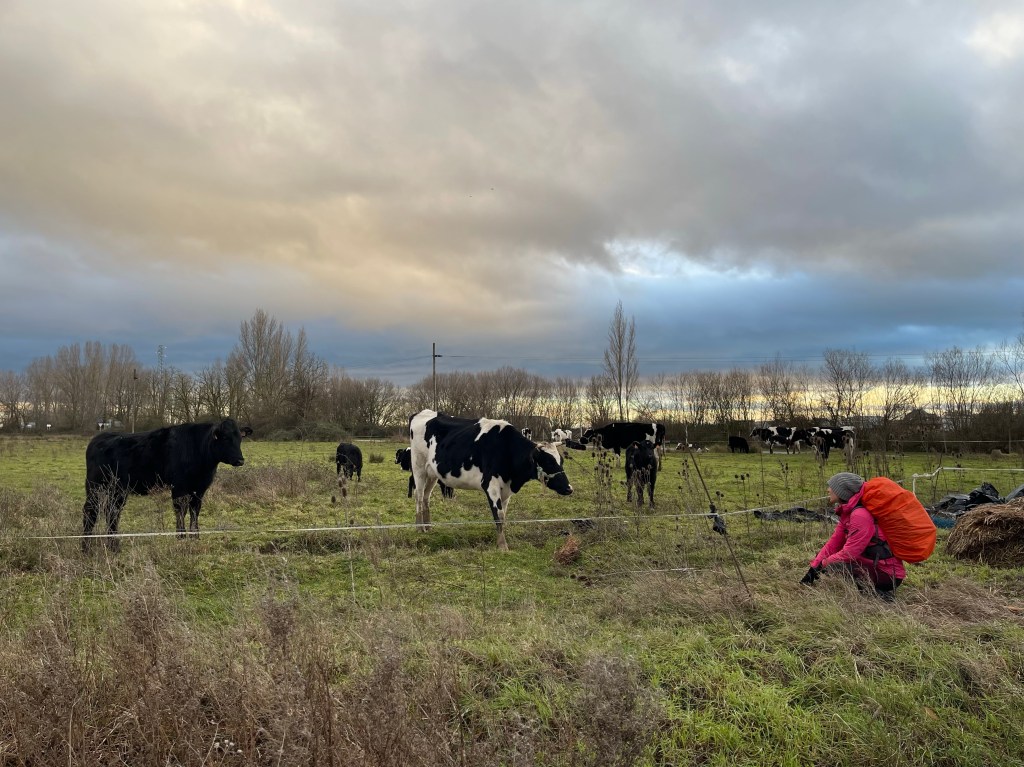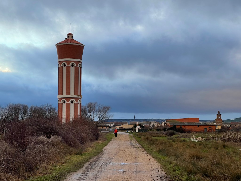 Close to Hospital de Orbigo, the path breaks off from the highway. It’s a muddy path, with a red brick tower ahead of us. Nearer to the tower there are some cow pats, and we soon see the source—there are a bunch of black and white cows to the side.