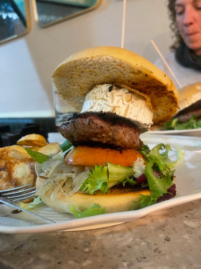 We find an open bar which serves some dinner. We both get the goat cheese burger which is amazing, and some local beer, Mahou Maestra. It’s a good night.