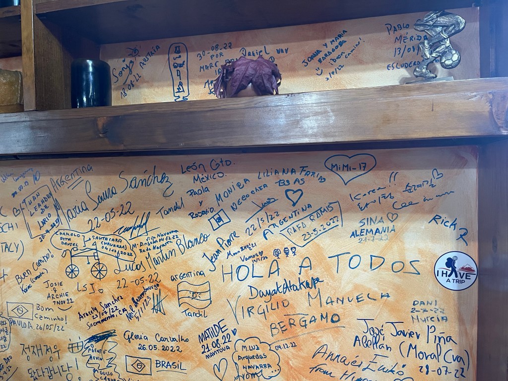 I have a really good sleep, waking up naturally at 8am. It’s -1°C, cold but the weather is clear, and it feels fresh. We find a bar on the Camino route to start our day. I have a coffee and a carrot cake. At the bar, Edoardo gifts Ingrid and me a Tau cross, the symbol of Saint Francis of Assisi. He bought them at the albergue before we left.