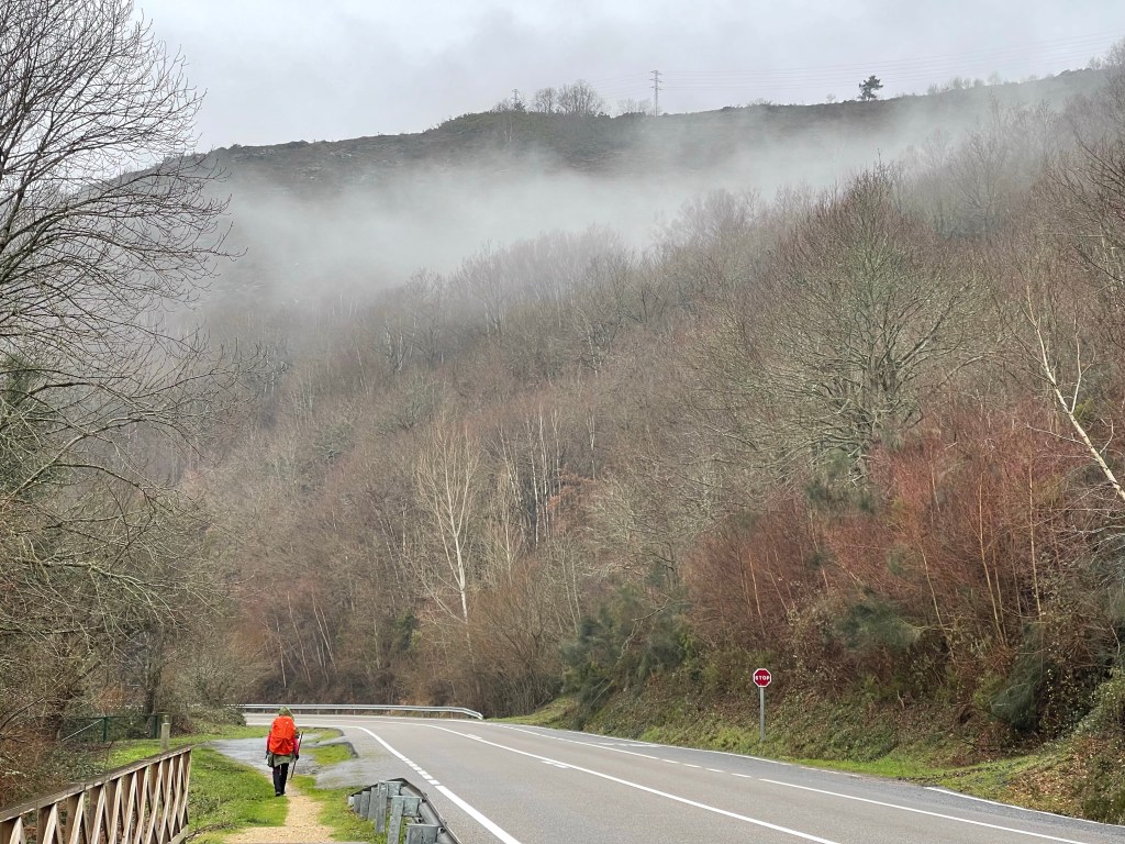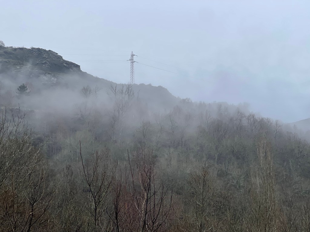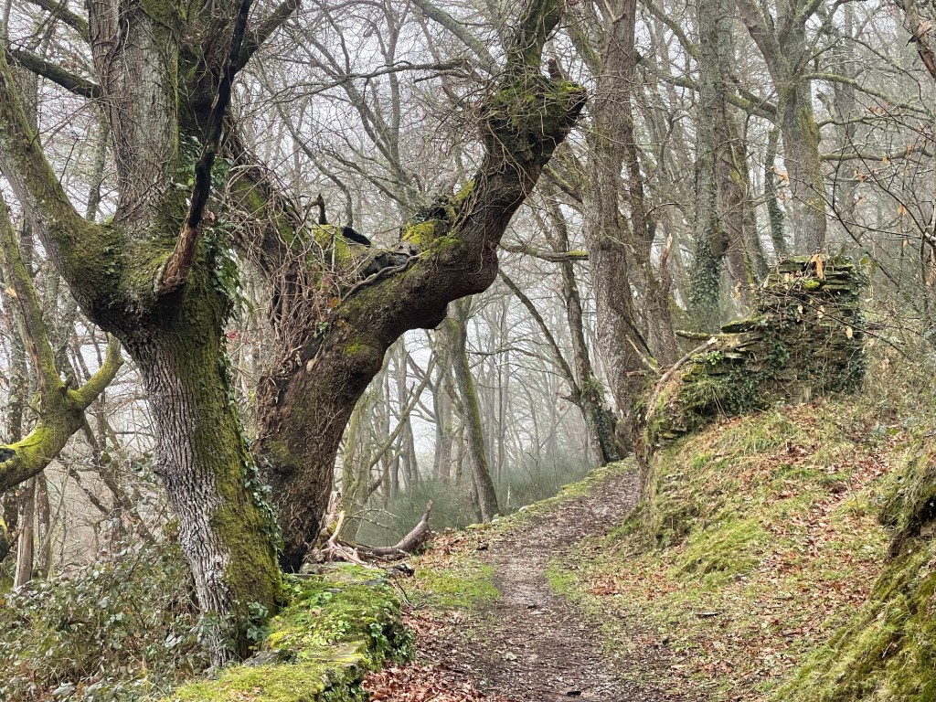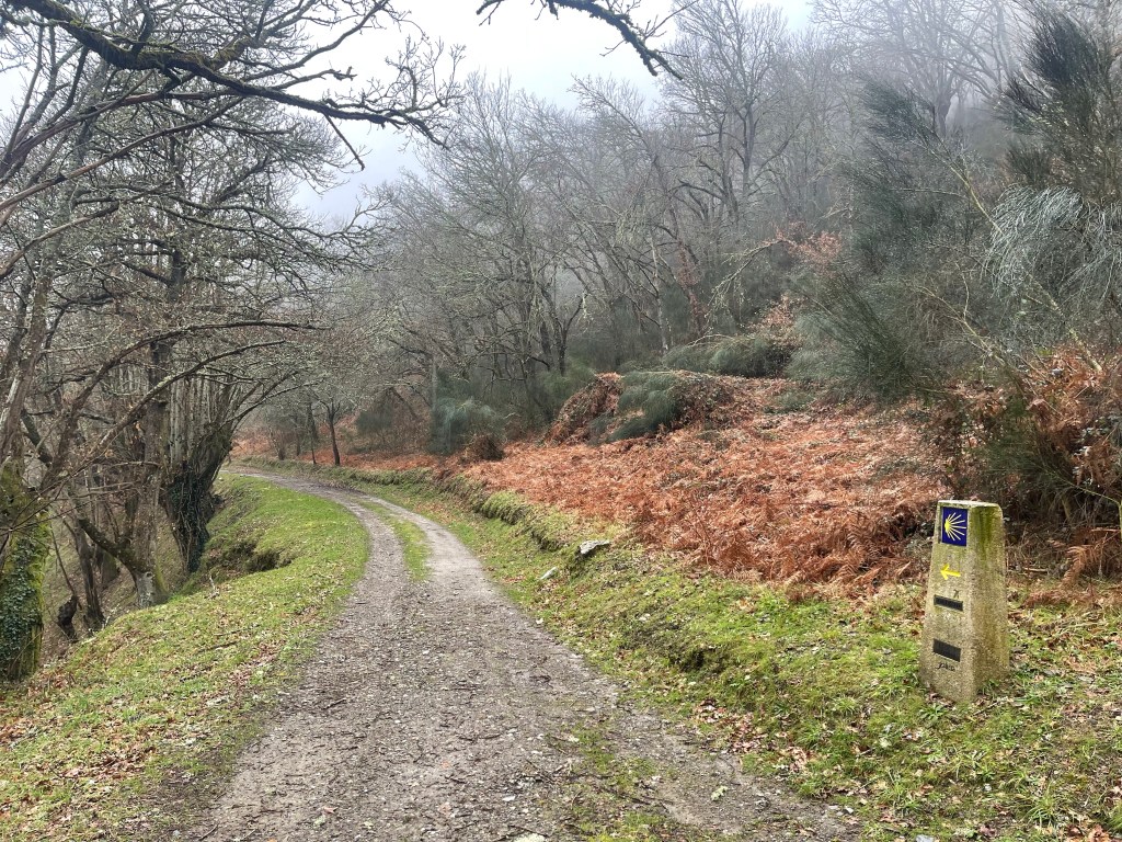 I stop to take a pee after San Cristovo do Real, and so I end up without Ingrid. The path after goes through forest, and with the twisting branches, the moss and the mist…being alone in the forest takes on a mystical air. I wouldn’t be surprised if I found a witch now.