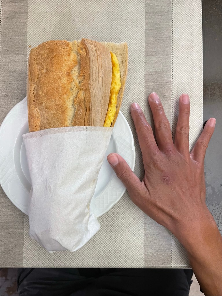 At Samos, I step into the first bar I find. Ingrid is there, she just arrived and got a coffee. I join her, getting a coffee of my own. I order a tortilla francesa (plain omelette) and receive a huge bocadillo of it. I didn’t hear them say “bocadillo” clearly, so end up getting more food than I wanted. But it’s alright. I eat half and para llevar (takeaway) the rest.