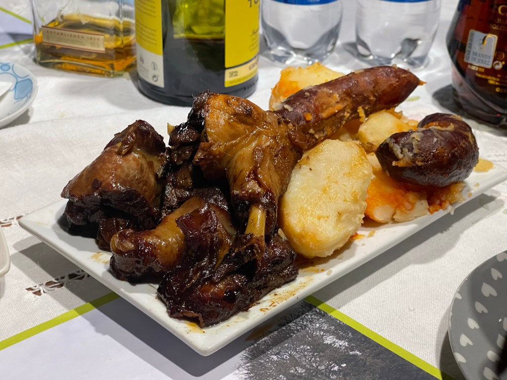 She sits us down at a cosy dining table with some wine. We accept her offer of caldo gallego, which warms our insides. Turns out we are actually hungry, or maybe because the food is good and warm. Isabel continues to ply us with food and wine, turning this into a proper meal. She serves us a plate of potatoes, chorizo, and chicken(!)—to my delight.