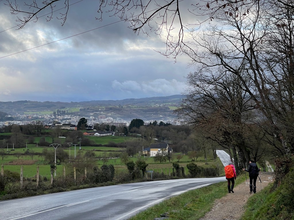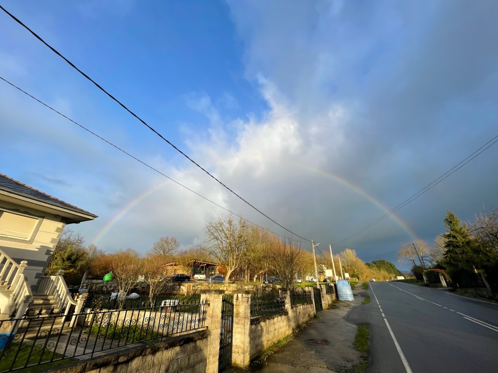 We see Sarria ahead from about two kilometres away. The most delicate of showers start. The setting sun renders everything beautifully as we near the city. A full rainbow appears behind us, a precious fleeting moment.