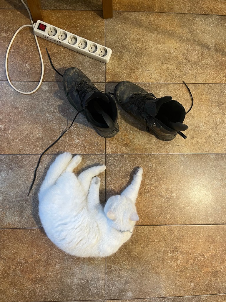 We have our packed simple dinner, with Ingrid’s store of camomile tea. There is not much in the way of utensils here, but there are three cups and a conduction stove. Together with my titanium cup for heating and drinking, we have enough.