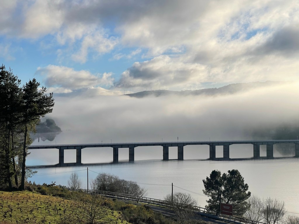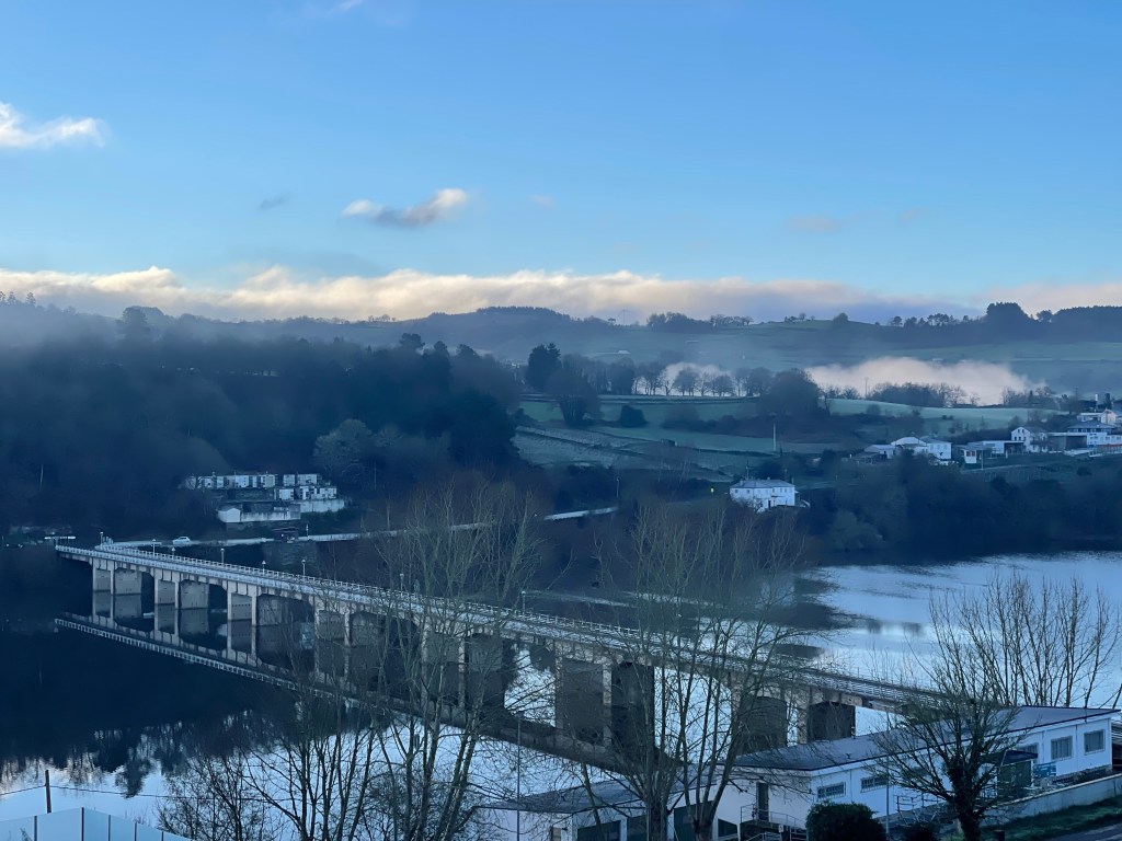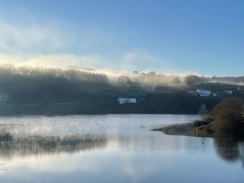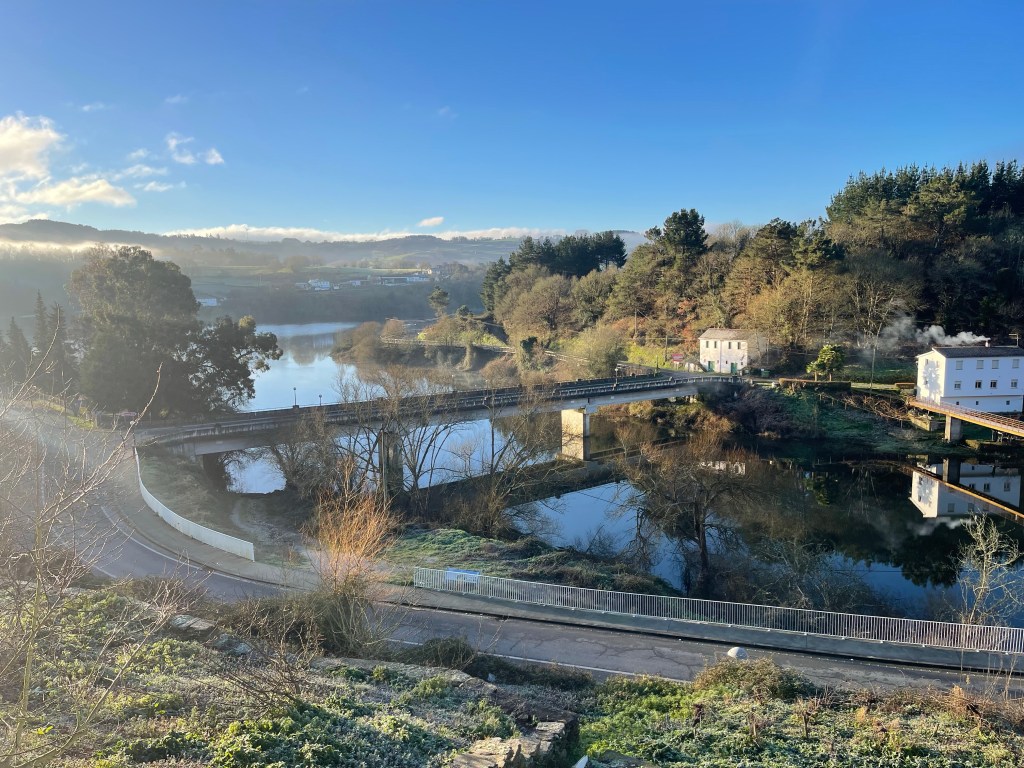 I leave at 9.30am to a 2°C bright sunny day. The route takes you back across the river from Portomarín by another bridge. The water is still, with clear reflections. Low mist hangs on the opposite side.