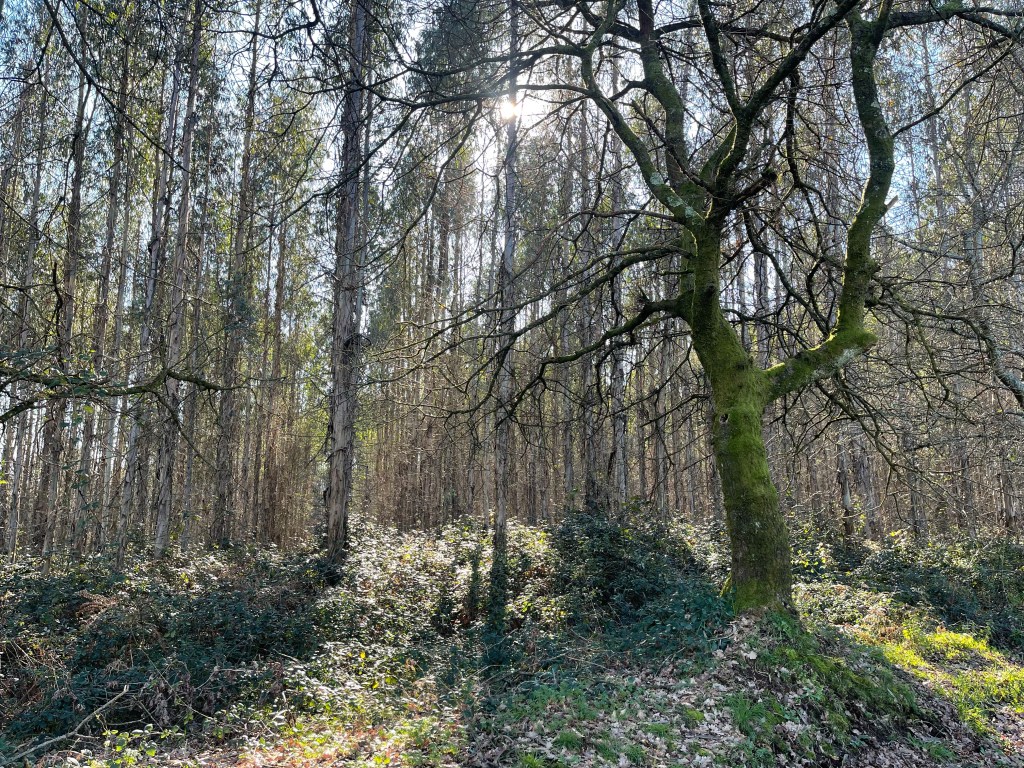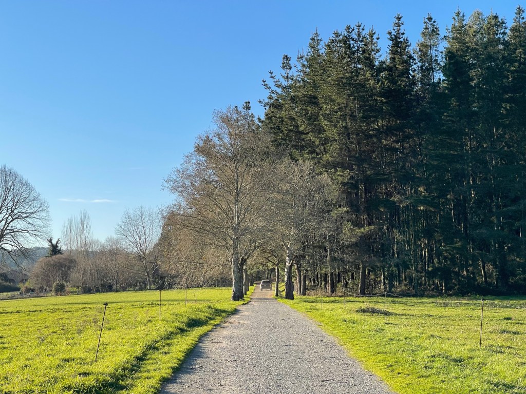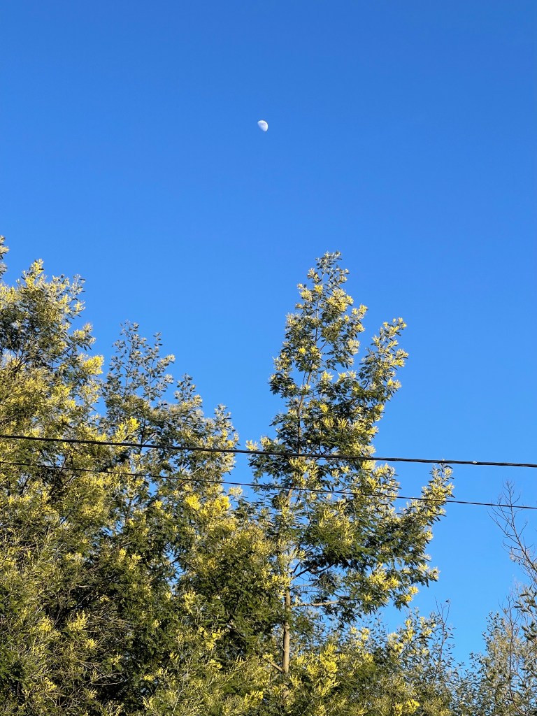 We walk through beautiful village roads and forests that feel enchanted. There are some birds, and one of the fields we go past has dogs chasing each other. At some points there are fallen yellow mimosas on the ground.