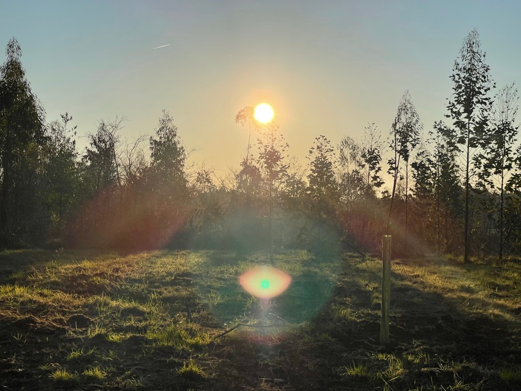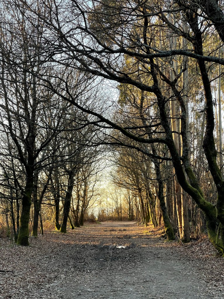 There’s a constant gradual incline up a path through a eucalyptus forest. At the top of the hill, we come level with Santiago de Compostela Airport. Brown leaves pepper the sides of the path. The trees are golden in the setting sun.