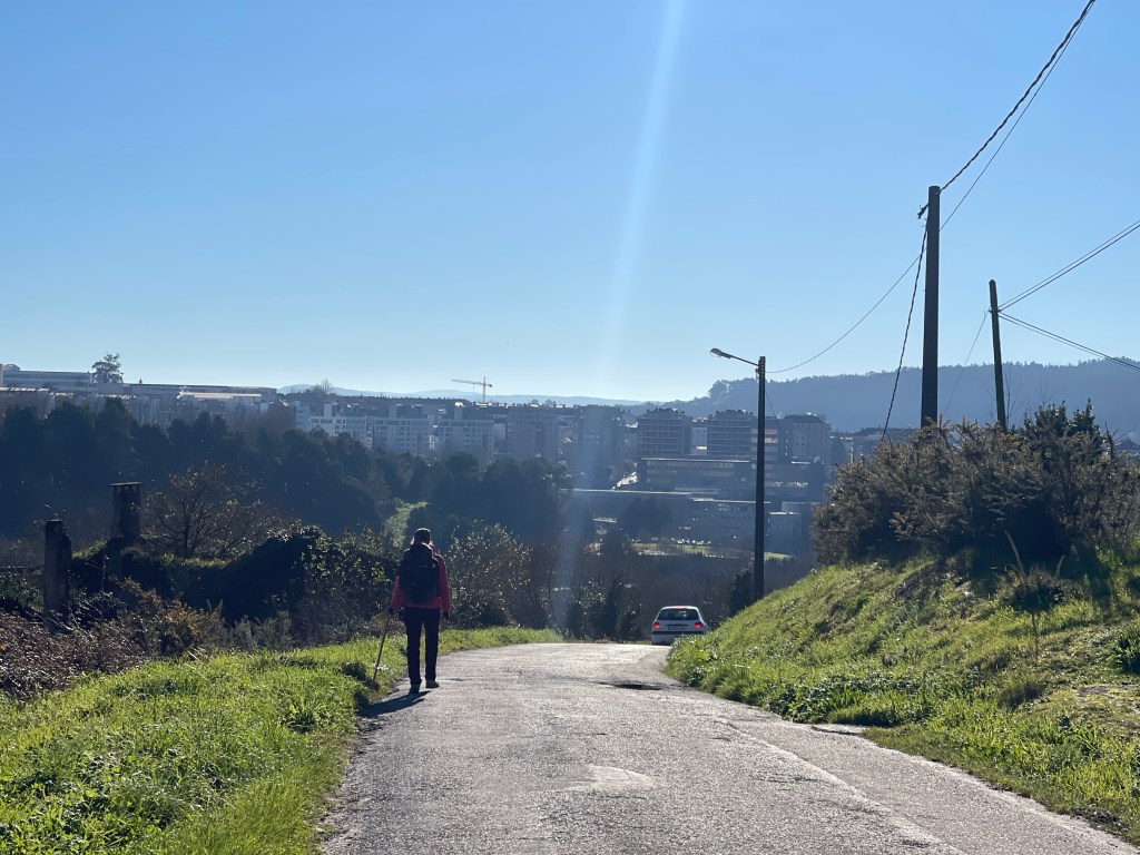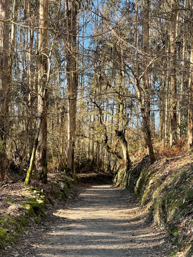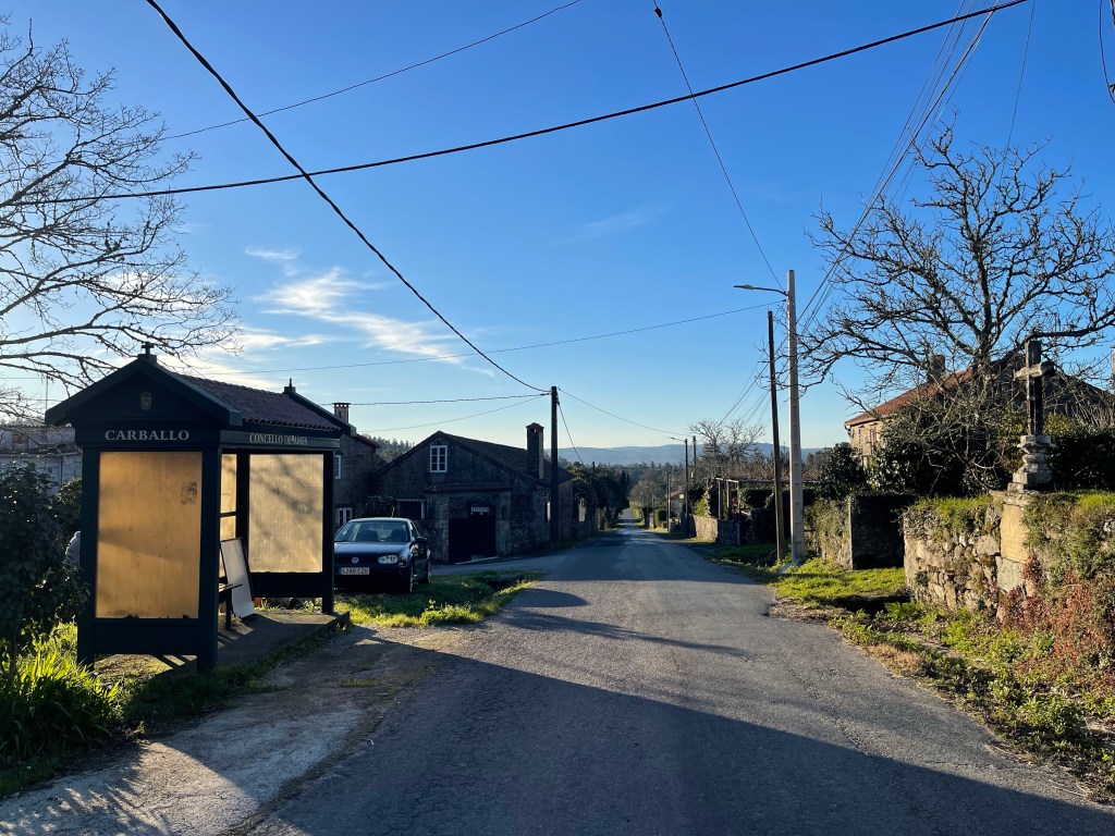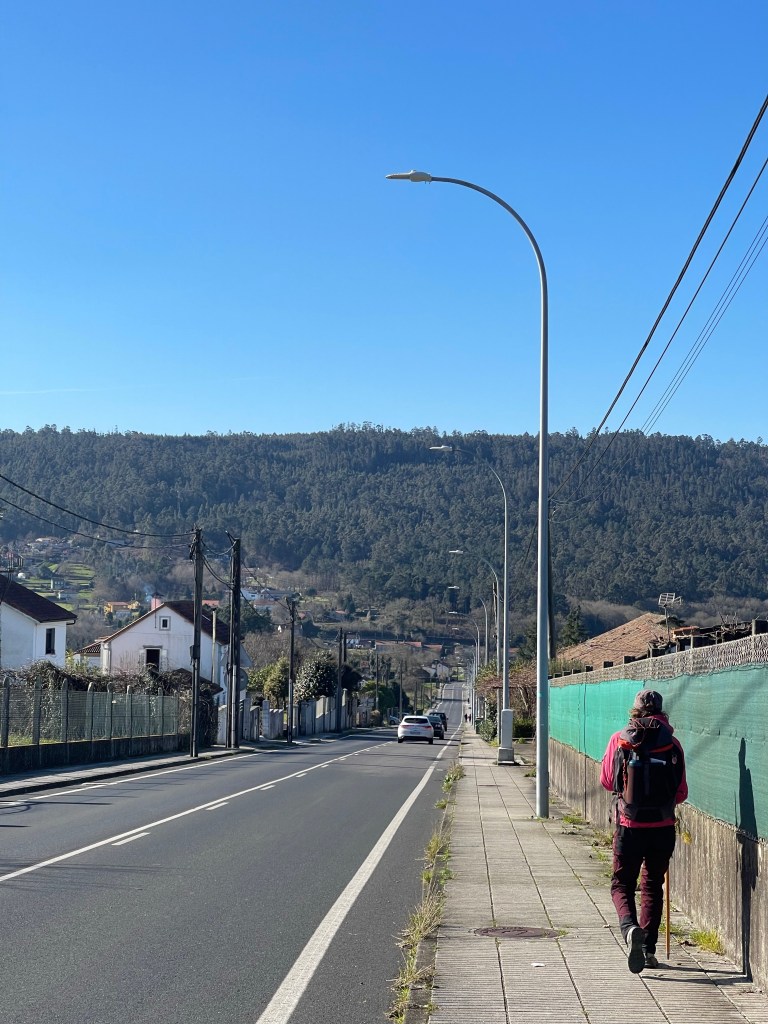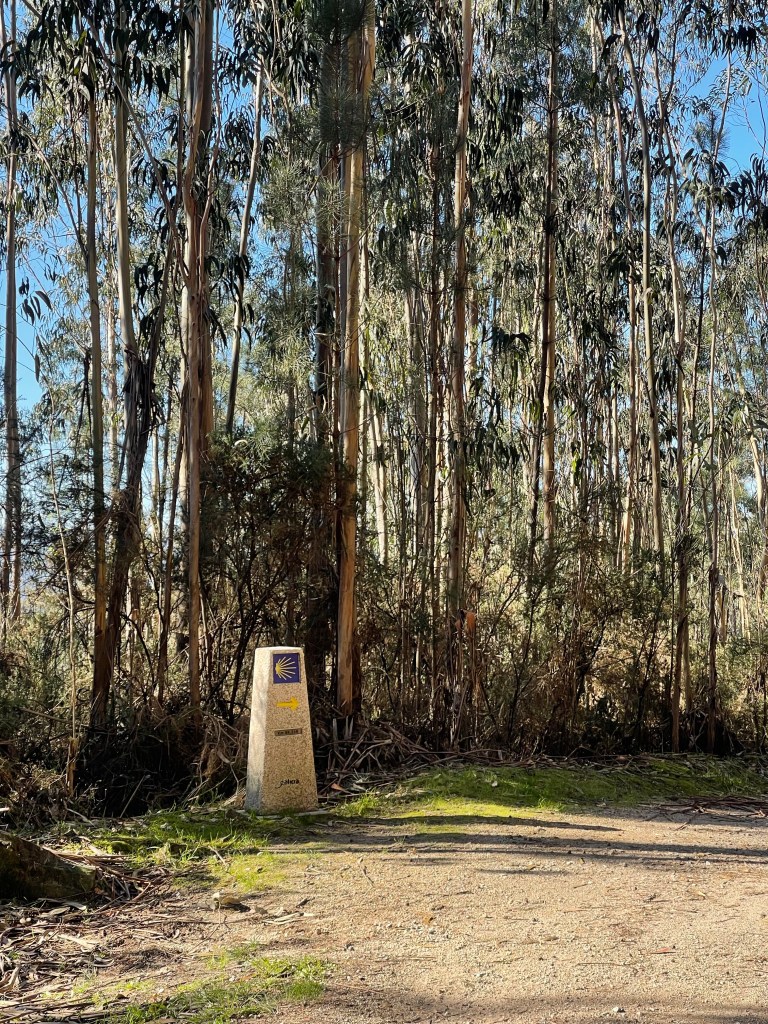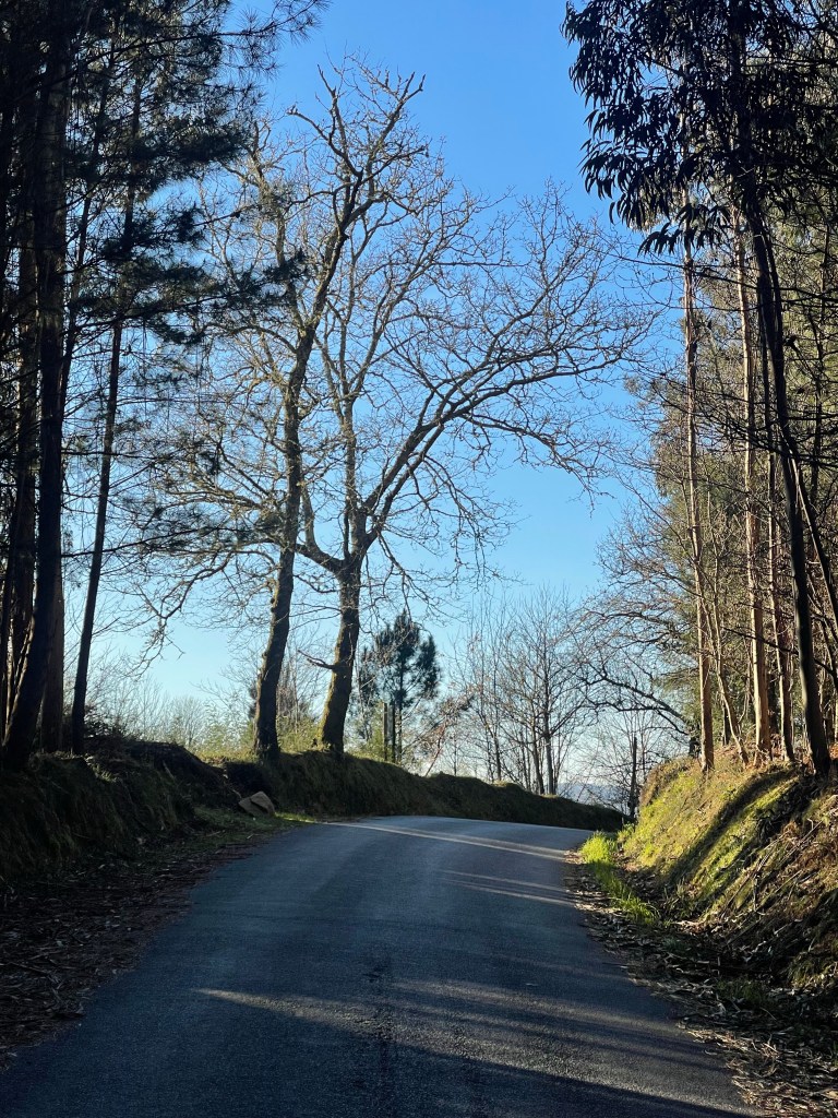 It’s not immediately obvious where the arrows are. But after initially referencing the map in the Xunta app, we soon reach the first few signs, and it starts to be clear on its own. It gets quiet quite quickly after leaving the historical centre of the city. A strangely familiar sensation returns—it feels like we are resuming the Way. Right outside the city, we’re soon back to the familiar terrain of Galician forest and countryside. It’s a sunny 8°C.