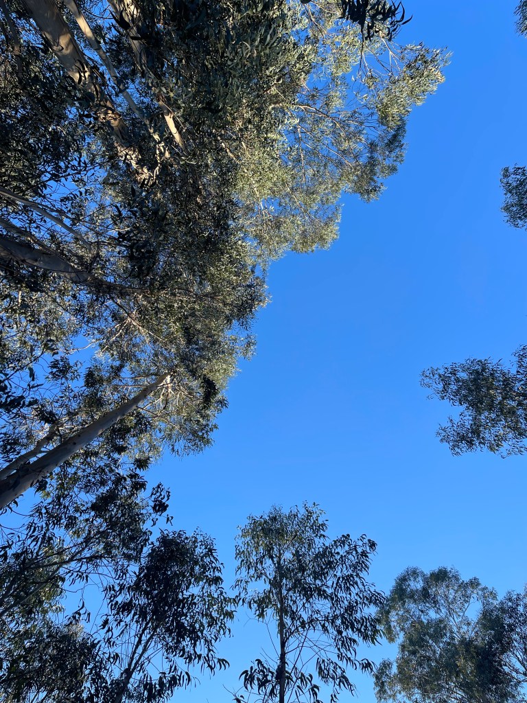 The route leads to a sustained upslope through eucalyptus forest. Birds chitter, encouraging me on. Sunlight hits parts of the forest, creating nice textures. Gentle winds produce susurrations with the leaves above me.