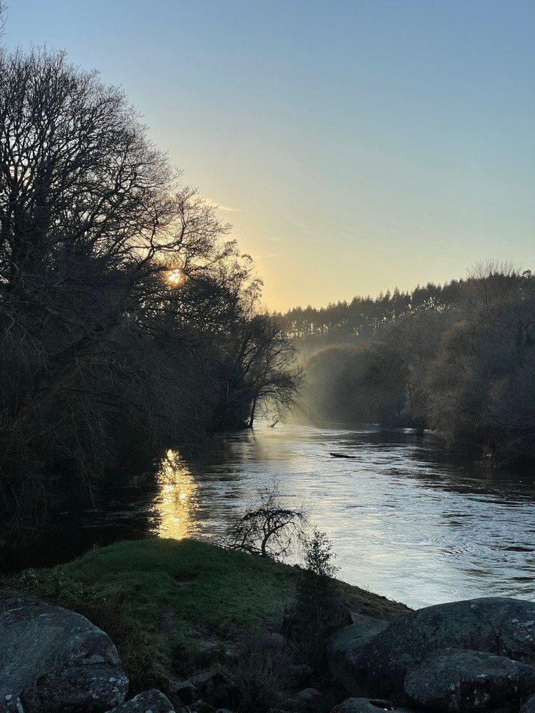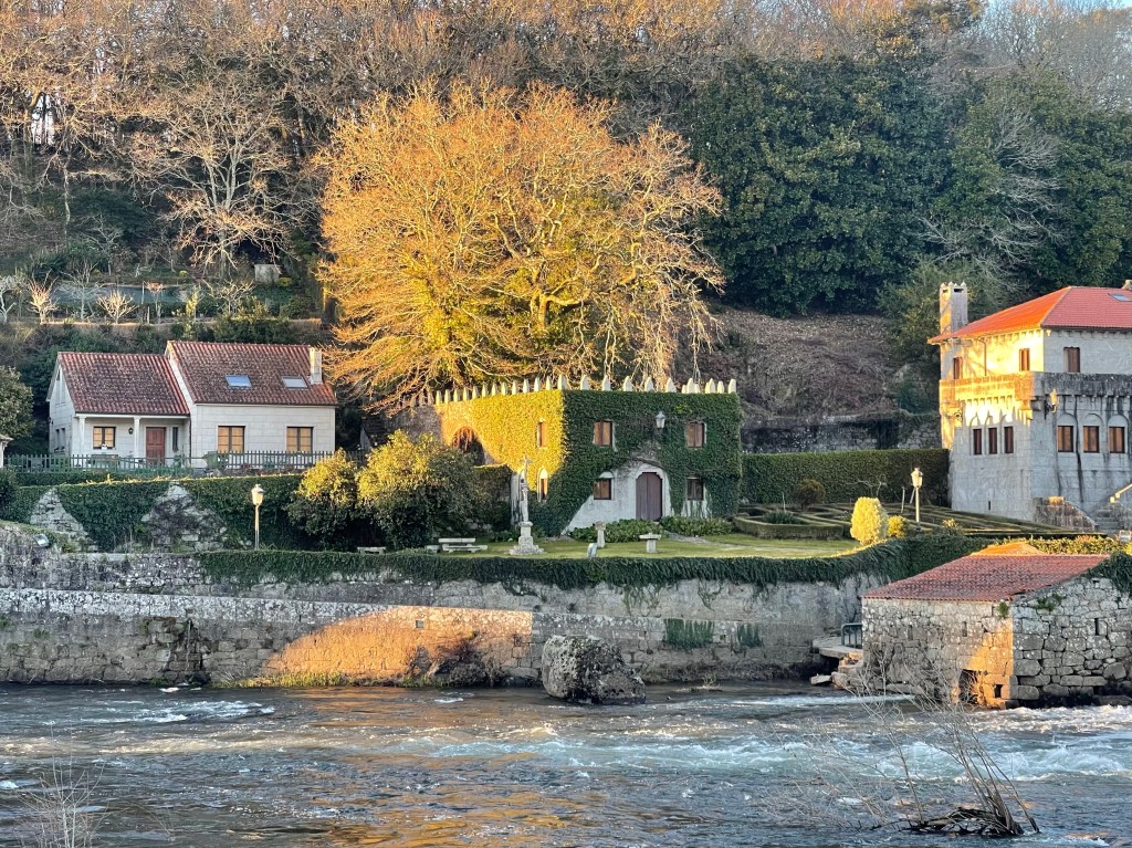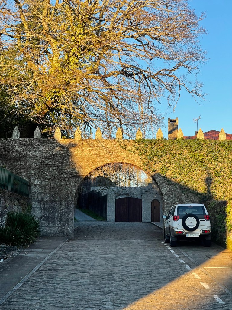 I see Ponte Maceira in sunlight as I walk down, and hear the sounds of a distant river. The moon is clear in the sky. Opposite the river, there’s a small castle building covered in vines. Google Maps says it’s Pazo de Baladrón, and it’s fascinating to me, but seems mostly closed. I take a seat at a bench after the bridge. The blonde-tipped trees are beautiful in sunset.