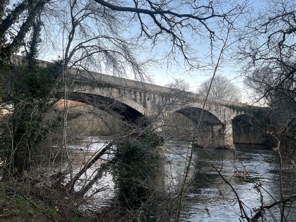 Leaving the town, distant bird sounds echo in the shallow valley. I join a river for a short portion, going under the arch of an old bridge.