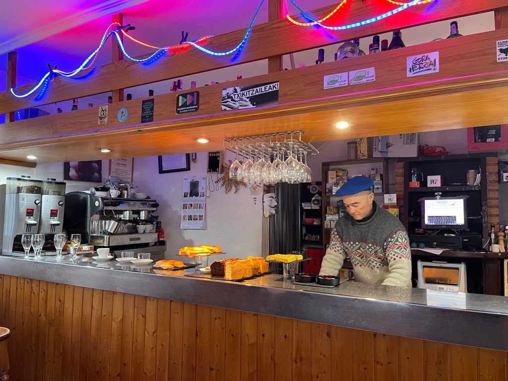 We then go back to the bar opposite the hostel for a final drink. Earlier, we had seen a bottle of liquor from Navarra, and since it’s our last day in the region, we wanted to try it. I decide I want to treat my trail family— Ji Sung, Areum, Samuel, Diego, and Guti—since the wine fountain was dry. The liquor is called pacharán, made from blackthorn. It’s a delicious nightcap, sweet and warm.