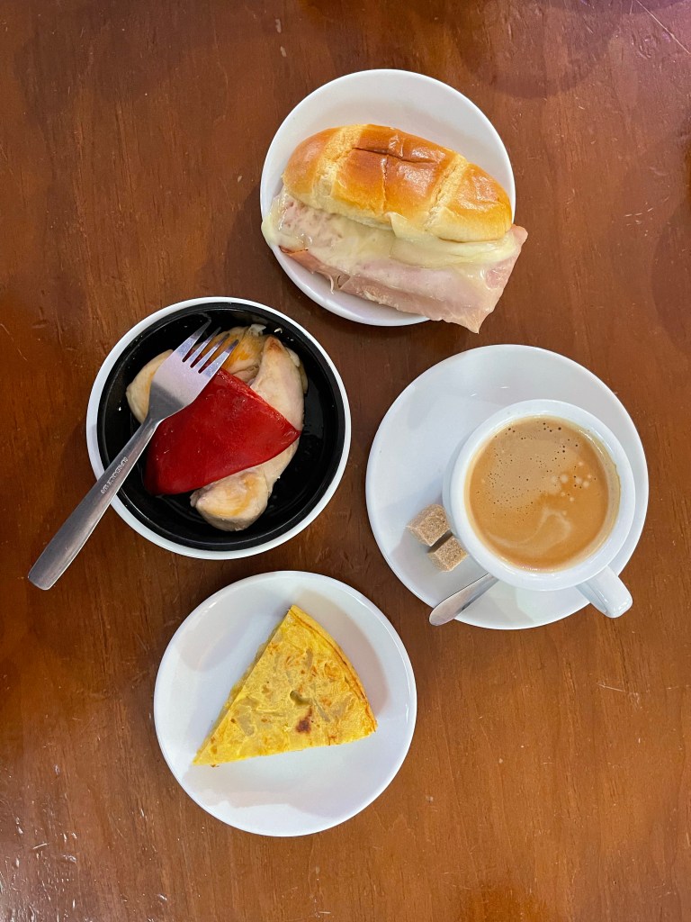 We reach Los Arcos, one of the Brierley stops, although we want to push a bit further today. I get a homemade soy and vegetable empanada (meat pastry) at a bakery, and Guti walks in! Catching up with Ji Sung, Areum, and Diego at a bar ahead, we all sit down for a small meal. I get a gilda, a stick of olives and anchovies, and some tinto de verano. Gilda is amazing—it’s waves of umami, tartness, spiciness, in one smooth mouthfeel.