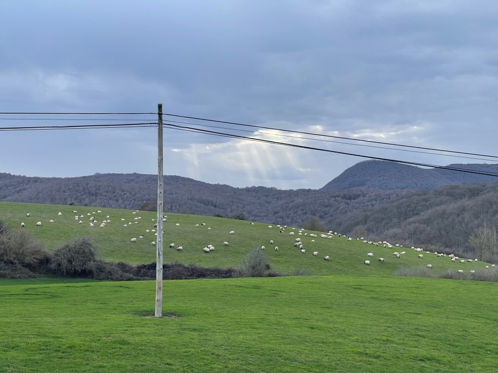 Apart from some quiet towns, today it’s mainly long dirt and gravel roads along relatively flat plains. I’m just happy it’s not car roads. There are distant highway sounds, but surrounding us is mostly nature and rolling farmland.